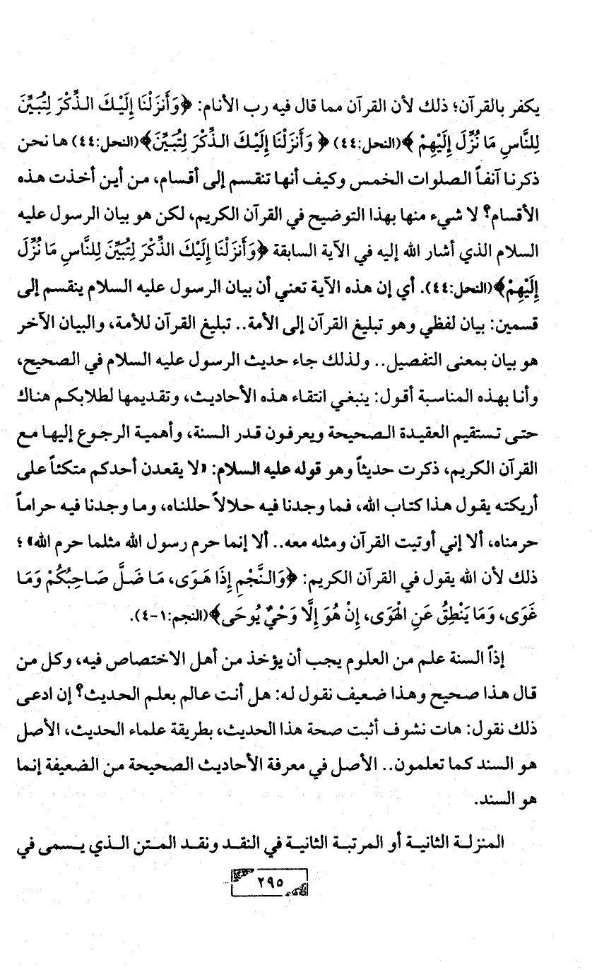 يكفر بالقرآن؛ ذلك لأن القرآن مما قال فيه رب الأنام: {وَأَنزَلْنَا إِلَيْكَ الذِّكْرَ لِتُبَيِّنَ لِلنَّاسِ مَا نُزِّلَ إِلَيْهِمْ} (النحل:44) {وَأَنزَلْنَا إِلَيْكَ الذِّكْرَ لِتُبَيِّنَ} (النحل:44) ها نحن ذكرنا آنفاً الصلوات الخمس وكيف أنها تنقسم إلى أقسام، من أين أخذت هذه الأقسام? لا شيء منها بهذا التوضيح في القرآن الكريم، لكن هو بيان الرسول عليه السلام الذي أشار الله إليه في الآية السابقة {وَأَنزَلْنَا إِلَيْكَ الذِّكْرَ لِتُبَيِّنَ لِلنَّاسِ مَا نُزِّلَ إِلَيْهِمْ} (النحل:44). أي إن هذه الآية تعني أن بيان الرسول عليه السلام ينقسم إلى قسمين: بيان لفظي وهو تبليغ القرآن إلى الأمة .. تبليغ القرآن للأمة، والبيان الآخر هو بيان بمعنى التفصيل .. ولذلك جاء حديث الرسول عليه السلام في الصحيح، وأنا بهذه المناسبة أقول: ينبغي انتقاء هذه الأحاديث، وتقديمها لطلابكم هناك حتى تستقيم العقيدة الصحيحة ويعرفون قدر السنة، وأهمية الرجوع إليها مع القرآن الكريم، ذكرت حديثاً وهو قوله عليه السلام: «لا يقعدن أحدكم متكئاً على أريكته يقول هذا كتاب الله، فما وجدنا فيه حلالاً حللناه، وما وجدنا فيه حراماً حرمناه، ألا إني أوتيت القرآن ومثله معه .. ألا إنما حرم رسول الله مثلما حرم الله»؛ ذلك لأن الله يقول في القرآن الكريم: {وَالنَّجْمِ إِذَا هَوَى، مَا ضَلَّ صَاحِبُكُمْ وَمَا غَوَى، وَمَا يَنْطِقُ عَنِ الْهَوَى، إِنْ هُوَ إِلَّا وَحْيٌ يُوحَى} (النجم:1 - 4).