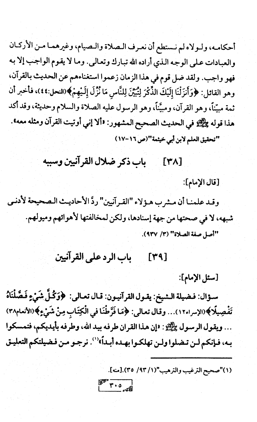 أحكامه، ولولاه لم نستطع أن نعرف الصلاة والصيام، وغيرهما من الأركان والعبادات على الوجه الذي أراده الله تبارك وتعالى. وما لا يقوم الواجب إلا به فهو واجب. ولقد ضل قوم في هذا الزمان زعموا استغناءهم عن الحديث بالقرآن, وهو القائل: {وَأَنزَلْنَا إِلَيْكَ الذِّكْرَ لِتُبَيِّنَ لِلنَّاسِ مَا نُزِّلَ إِلَيْهِمْ} (النحل:44)، فأخبر أن ثمة مبيّناً، وهو القرآن، ومبيَّناً، وهو الرسول عليه الصلاة والسلام وحديثة، وقد أكد هذا قوله - صلى الله عليه وآله وسلم - في الحديث الصحيح المشهور: «ألا إني أوتيت القرآن ومثله معه».