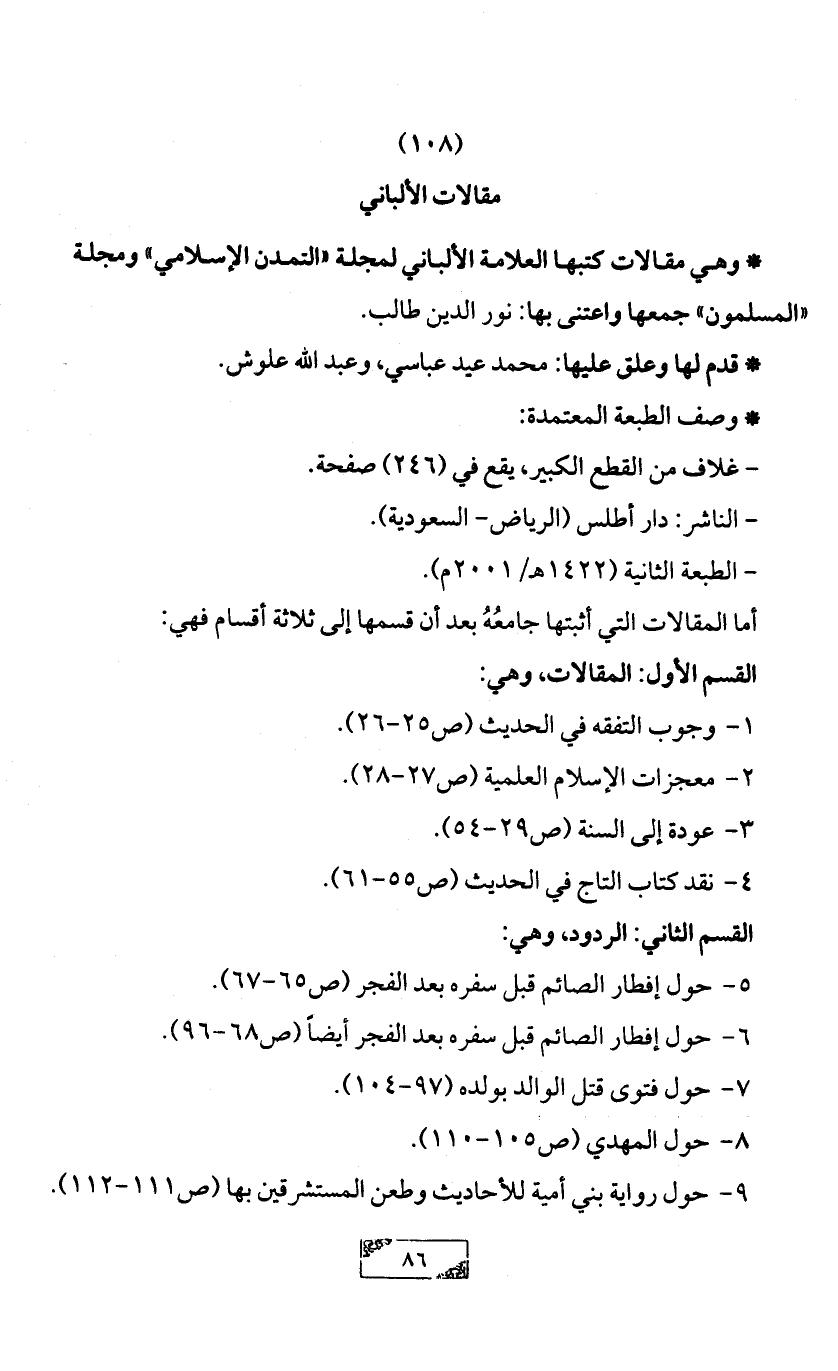 * وهي مقالات كتبها العلامة الألباني لمجلة «التمدن الإسلامي» ومجلة «المسلمون» جمعها واعتنى بها: نور الدين طالب.