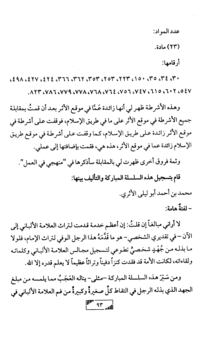 وهذه الأشرطة ظهر لي أنها زائدة عَمَّا في موقع الأثر بعد أن قمتُ بمقابلة جميع الأشرطة في موقع الأثر على ما في طريق الإسلام، فوقفت على أشرطة في موقع الأثر زائدة على طريق الإسلام، كما وقفت على أشرطة في موقع طريق الإسلام زائدة عما في موقع الأثر، هذه هي، فقمت بإضافتها إلى عملي.