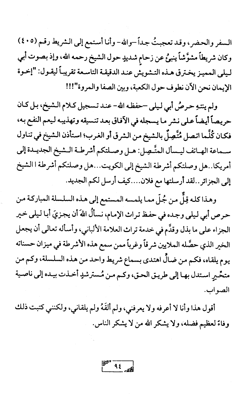 السفر والحضر، وقد تعجبتُ جداً -والله- وأنا أستمع إلى الشريط رقم (405) وكان شريطاً مشوَّشاً ينبئُ عن زحامٍ شديدٍ حول الشيخ رحمه الله، وإذ بصوت أبي ليلى المميز يخترق هذه التشويش عند الدقيقة التاسعة تقريباً ليقول: "إخوة الإيمان نحن الآن نطوف حول الكعبة، وبين الصفا والمروة"!!!