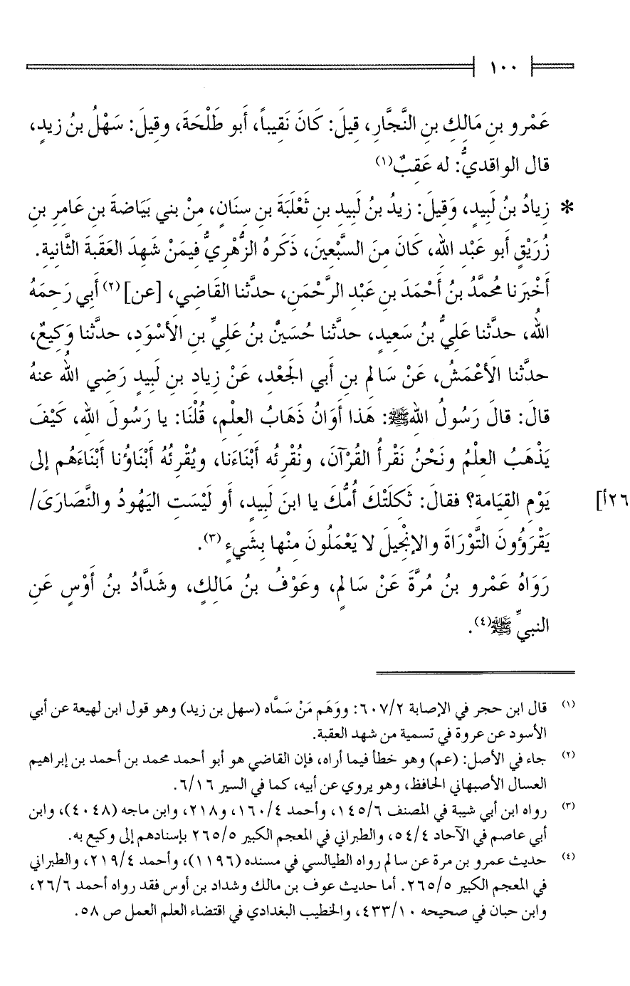 أَخْبَرنا مُحمَّدُ بنُ أَحْمَدَ بنِ عَبْدِ الرَّحْمَنِ، حدَّثنا القَاضِى، [عن] (¬2) أَبِى رَحِمَهُ اللهُ، حدَّثنا عَلِىُّ بنُ سَعِيدٍ، حدَّثنا حُسَينُ بنُ عَلِيِّ بنِ الأَسْوَدِ، حدَّثنا وَكِيعٌ، حدَّثنا الأَعْمَشُ، عَنْ سَالِم بنِ أَبي الجَعْدِ، عَنْ زِيادِ بنِ لَبِيدٍ رَضِي اللهِ عنهُ قالَ: قالَ رَسُولُ اللهِ - صلى الله عليه وسلم -: هَذا أَوَانُ ذَهَابُ العِلْمِ، قُلْنَا: يا رَسُولَ اللهِ، كَيْفَ يَذْهَبُ العِلْمُ ونَحْنُ نَقْرأُ القُرْآنَ، ونُقْرِئُه أَبْنَاءَنا، ويُقْرِئُهُ أَبْنَاؤُنا أَبْنَاءَهُم إلى يَوْمِ القِيَامة؟ فقالَ: ثَكِلَتْكَ أُمُّكَ يا ابنَ لَبِيدٍ، أَو لَيْسَتِ اليَهُودُ والنَّصَارَىَ يَقْرَؤُونَ التَّوْرَاةَ والإنجِيلَ لا يَعْمَلُونَ مِنْها بِشَيءٍ (¬3).