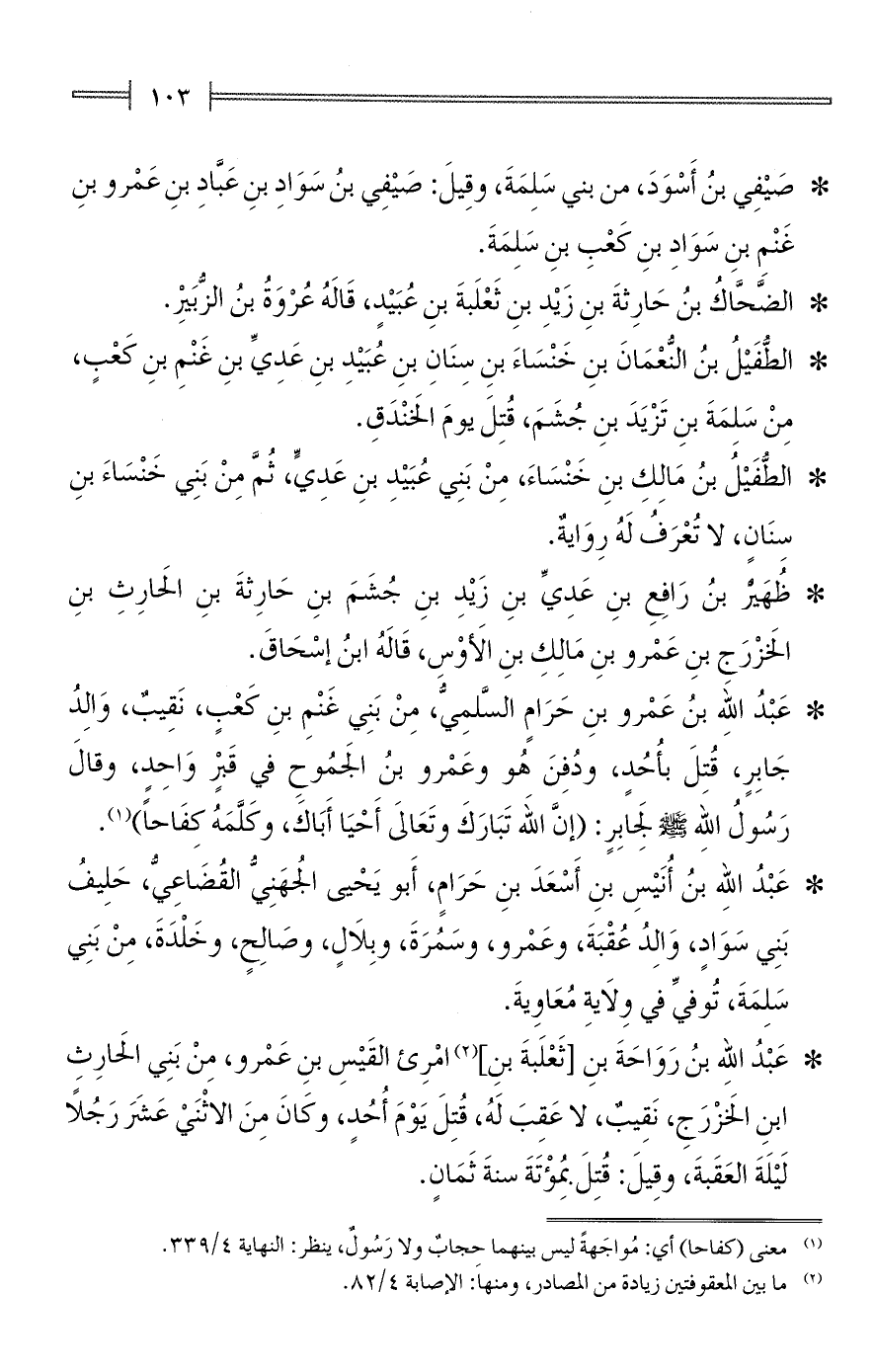 * الطُّفَيْلُ بنُ النُّعْمَانَ بنِ خَنْسَاءَ بنِ سِنَانِ بنِ عُبَيْدِ بنِ عَدِيِّ بنِ غَنْمِ بنِ كَعْبٍ، مِنْ سَلِمَةَ بنِ تَزْيَدَ بنِ جُشَمَ، قُتِلَ يومَ الخَنْدَقِ.