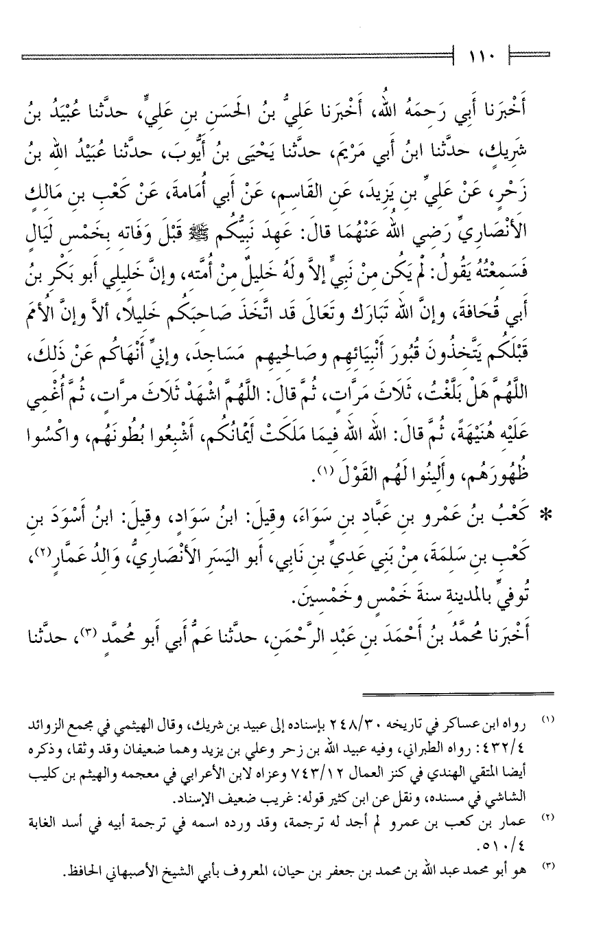 أَخْبَرنا أَبِي رَحِمَهُ اللهُ، أَخْبَرنا عَلِيُّ بنُ الحَسَنِ بنِ عَلِيٍّ، حدَّثنا عُبْيَدُ بنُ شَرِيكٍ، حدَّثنا ابنُ أَبي مَرْيمَ، حدَّثنا يَحْيَى بنُ أَيُّوبَ، حدَّثنا عُبَيْدُ اللهِ بنُ زَحْرٍ، عَنْ عَلِيِّ بنِ يَزِيدَ، عَنِ القَاسِمِ، عَنْ أَبي أُمَامةَ، عَنْ كَعْبِ بنِ مَالِكٍ الأَنْصَارِيِّ رَضِي اللهِ عَنْهُمَا قالَ: عَهِدَ نَبِيُّكُم - صلى الله عليه وسلم - قَبْلَ وَفَاتهِ بِخَمْسِ لَيَالٍ فَسَمِعْتُهُ يَقُولُ: لم يَكُن مِنْ نَبِيٍّ إلَّا ولَهُ خَلِيلٌ مِنْ أُمَّتهِ، وإنَّ خَلِيلِى أَبو بَكْرِ بنُ أَبي قُحَافةَ، وإنَّ اللهِ تَبَارَك وتَعَالىَ قَد اتَّخَذَ صَاحِبَكُم خَلِيلًا، ألَّا وإنَّ الأُمَم قَبْلَكُم يَتَّخِذُونَ قُبُورَ أَنْبِيَائِهِم وصَالحِيهِم مَسَاجِدَ، وإنِّي أَنْهَاكم عَنْ ذَلِكَ، اللَّهُمَّ هَلْ بَلَّغْتُ، ثَلَاثَ مَرَّاتٍ، ثُمَّ قالَ: اللَّهُمَّ اشْهَدْ ثَلَاثَ مرَّاتٍ، ثُمَّ أُغْمِي عَلَيْهِ هُنَيْهَةً، ثُمَّ قالَ: اللهَ اللهَ فِيمَا مَلَكَتْ أَيمانُكُم، أَشْبِعُوا بُطُونَهُم، واكْسُوا ظُهُورَهُم، وأَلِينُوا لَهُم القَوْلَ (¬1).