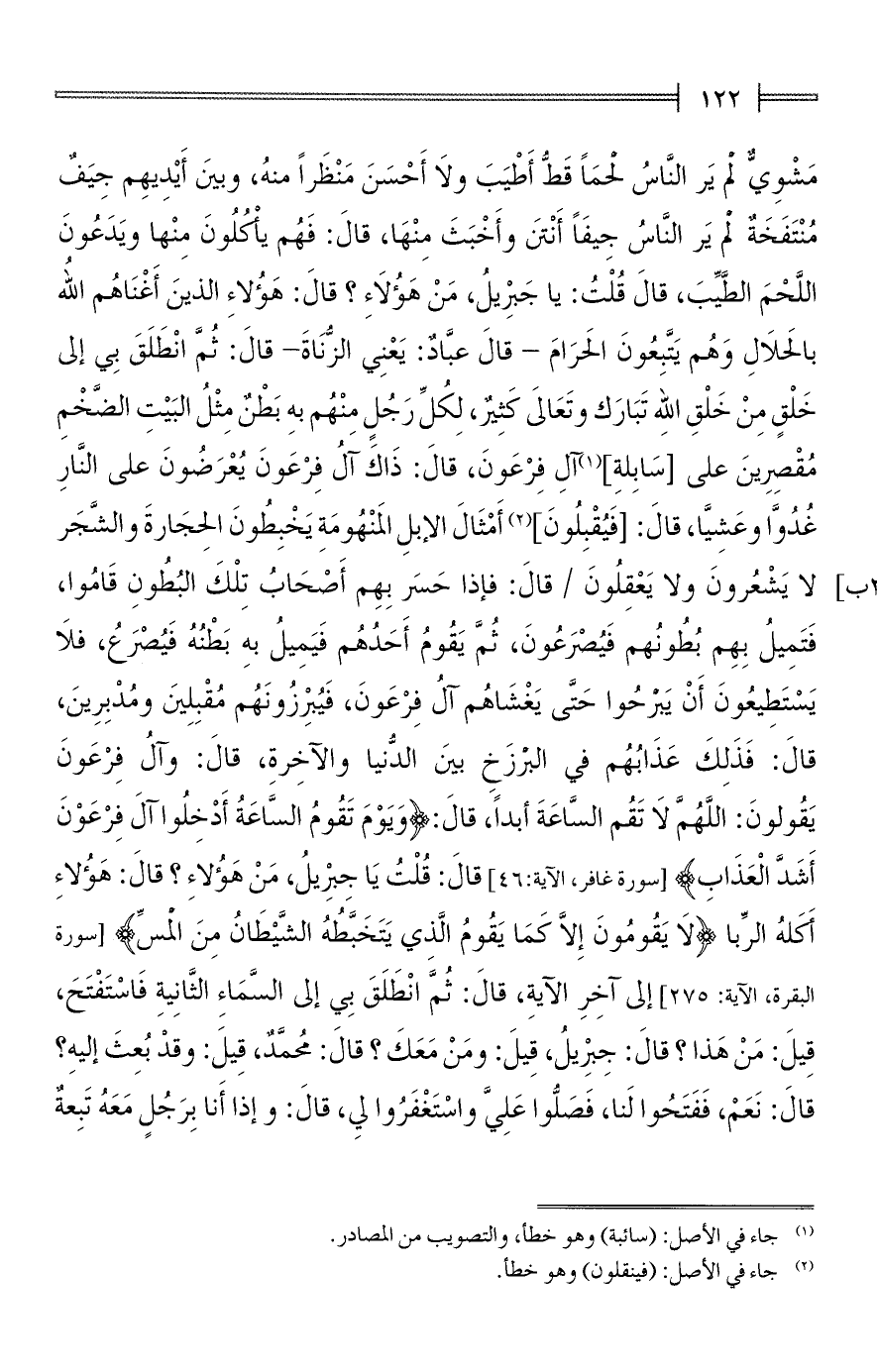 مَشْوِيٌّ لمْ يَر النَّاسُ لَحْمًا قَطُّ أَطْيَبَ ولَا أَحْسَنَ مَنْظَرًا منهُ، وبينَ أَيْدِيهِم جِيَفٌ مُنْتَفَخَةٌ لمْ يَر النَّاسُ جِيفًا أَنتَن وأَخْبَثَ مِنْهَا، قالَ: فَهُم يأْكُلُونَ مِنْها ويَدَعُونَ اللَّحْمَ الطَّيِّبَ، قالَ قُلْتُ: يا جَبْرِيلُ، مَنْ هَؤُلَاءِ؟ قالَ: هَؤُلاءِ الذينَ أَغْنَاهُم اللهُ بالحَلَالِ وَهُم يَتَّبِعُونَ الحَرَامَ -قالَ عبَّادٌ: يَعْنِي الزُّنَاةَ- قالَ: ثُمَّ انْطَلَقَ بِي إلى خَلْقٍ مِنْ خَلْقِ اللهِ تَبَارَك وتَعَالى كَثِيرٌ، لِكُلِّ رَجُلٍ مِنْهُم به بَطْنٌ مِثْلُ البَيْتِ الضَّخْمِ مُقْصِرِينَ على [سَابِلةِ] (¬1) آلِ فِرْعَونَ، قالَ: ذَاكَ آلُ فِرْعَونَ يُعْرَضُونَ على النَّارِ غُدُوَّا وعَشِيَّا، قالَ: [فَيُقْبِلُونَ] (¬2) أَمْثَالَ الإبلِ المَنْهُومَةِ يَخْبِطُونَ الحِجَارةَ والشَّجَر لا يَشْعُرونَ ولا يَعْقِلُونَ قالَ: فإذا حَسَر بِهِم أَصْحَابُ تِلْكَ البُطُونِ قَامُوا، فَتَمِيلُ بِهِم بُطُونُهم فَيُصْرَعُونَ، ثُمَّ يَقُومُ أَحَدُهُم فَيَمِيلُ به بَطْنُهُ فَيُصْرَعُ، فلَا يَسْتَطِيعُونَ أَنْ يَبْرحُوا حَتَّى يَغْشَاهُم آلُ فِرْعَونَ، فَيُبرِزُونَهُم مُقْبِلِينَ ومُدْبِرِينَ، قالَ: فَذَلِكَ عَذَابُهُم في البْرزَخِ بينَ الدُّنيا والآخِرةِ، قالَ: وآلُ فِرْعَونَ يَقُولونَ: اللَّهُمَّ لَا تَقُم السَّاعَةَ أبدًا، قالَ: {وَيَوْمَ تَقُومُ السَّاعَةُ أَدْخِلُوا آلَ فِرْعَوْنَ أَشَدَّ الْعَذَابِ} [سورة غافر، الآية: 46] قالَ: قُلْتُ يَا جِبريلُ، مَنْ هَؤُلاءِ؟ قالَ: هَؤُلاءِ أَكَلهُ الرِّبا {لَا يَقُومُونَ إِلَّا كَمَا يَقُومُ الَّذِي يَتَخَبَّطُهُ الشَّيْطَانُ مِنَ الْمَسِّ} [سورة البقرة، الآية: 275] إلى آخِرِ الآيةِ، قالَ: ثُمَّ انْطَلَقَ بِي إلى السَّمَاءِ الثَّانِيةِ فَاسْتَفْتَحَ، قِيلَ: مَنْ هَذا؟ قالَ: جِبريلُ، قِيلَ: ومَنْ مَعَكَ؟ قالَ: مُحمَّدٌ، قِيلَ: وقدْ بُعِث إليهِ؟ قالَ: نَعَمْ، فَفَتَحُوا لَنا، فَصَلُّوا عَلِيَّ واسْتَغْفَرُوا لي، قالَ: وإذا أَنا بِرَجُلٍ مَعَهُ تَبِعةٌ