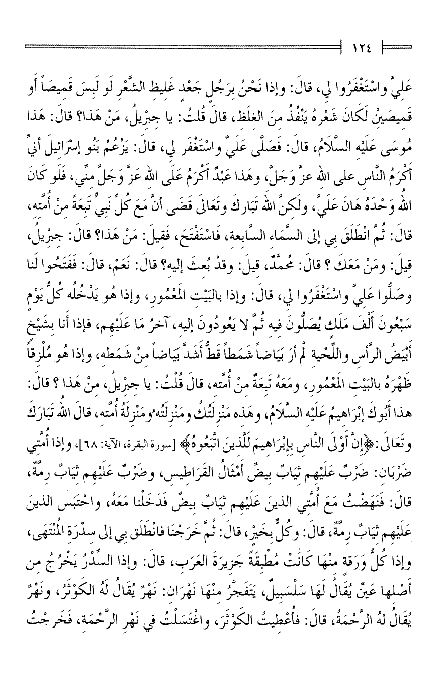 عَلِيَّ واسْتَغْفَرُوا لي، قالَ: وإذا نَحْنُ بِرَجُلٍ جَعْدٍ غَلِيظِ الشَّعْرِ لَو لَبِسَ قَمِيصًا أَو قَمِيصَينِ لَكَانَ شَعْرهُ يَنْفُذُ مِنَ الغِلَظِ، قالَ قُلتُ: يا جِبريلُ، مَنْ هَذا؟ قالَ: هَذا مُوسَى عَلَيْهِ السَّلَامُ، قالَ: فَصَلَّى عَلَيَّ واسْتَغْفَر لي، قالَ: يَزْعُمُ بَنُو إسْرَائِيلَ أنِّي أكرَمُ النَّاسِ على اللهِ عزَّ وَجَلَّ، وهَذا عَبْدٌ أَكْرَمُ عَلَى اللهِ عَزَّ وَجَلَّ مِنَّي، فَلَو كَانَ اللهُ وَحْدَهُ هَانَ عَلَيَّ، ولَكِنَّ اللهِ تَبَاركَ وتَعَالىَ قَضَى أنَّ مَعَ كُلِّ نَبِيٍّ تَبِعَةً مِنْ أُمَّتِهِ، قالَ: ثُمَّ انْطَلَقَ بِي إلى السَّمَاءِ السَّابِعةِ، فَاستَفْتَحَ، فَقِيلَ: مَنْ هَذا؟ قالَ: جِبْرِيلُ، قِيلَ: ومَنْ مَعَكَ؟ قالَ: مُحمَّدٌ، قِيلَ: وقدْ بُعِثَ إليهِ؟ قالَ: نَعَمْ، قالَ: فَفَتَحُوا لَنا وصَلُّوا عَلِيَّ واسْتَغْفَرُوا لي، قالَ: وإذا بالبَيْتِ المَعْمُورِ، وإذا هُو يَدْخُلُه كُلُّ يَوْمٍ سَبْعُونَ أَلْفَ مَلَكٍ يُصَلُّونَ فِيهِ ثُمَّ لا يَعُودُونَ إليهِ، آخرُ مَا عَلَيْهِم، فإذا أَنا بِشَيْخٍ أَبْيَضُ الرَّأسِ واللِّحْيةِ لمْ أرَ بَيَاضًا شَمَطًا قَطُّ أَشَدَّ بَيَاضًا مِنْ شَمَطهِ، وإذا هُو مُلْزِقًا ظَهْرَهُ بالبَيْتِ المَعْمُورِ، ومَعَهُ تَبِعَةٌ مِنْ أُمَّتهِ، قالَ قُلْتُ: يا جِبريلُ، مَنْ هَذا؟ قالَ: هذا أَبُوكَ إبْرَاهِيمُ عَلَيْهِ السَّلَامُ، وهَذِه مَنْزِلَتُكُ ومَنْزِلَتُهُ ومَنْزِلَةُ أُمَّتهِ، قالَ اللهِ تَبَارَكَ وتَعَالىَ: {إِنَّ أَوْلَى النَّاسِ بِإِبْرَاهِيمَ لَلَّذِينَ اتَّبَعُوهُ} [سورة البقرة الآية: 68]، وإذا أُمَّتِي ضَرْبَانِ: ضَرْبٌ عَلَيْهِم ثِيَابٌ بِيضٌ أَمْثَالُ القَرَاطِيسِ، وضَرْبٌ عَلَيْهِم ثِيَابٌ رِمَّةٌ، قالَ: فَنَهَضْتُ مَعَ أُمَّتِي الذينَ عَلَيْهِم ثِيَابٌ بِيضٌ فَدَخَلْنا مَعَهُ، واحْتَبَس الذينَ عَلَيْهِم ثِيَابٌ رِمَّةٌ، قالَ: وكُلٌّ بِخَيْرٍ، قالَ: ثُمَّ خَرَجْنَا فانْطَلَق بِي إلى سِدْرَةِ المُنْتَهَى، وإذا كُلُّ وَرَقةٍ مِنْهَا كَانَتْ مُطْبِقَةً جَزِيرَةَ العَرَبِ، قالَ: وإذا السِّدْرُ يَخْرُجُ مِن أَصْلِها عَين يُقَالُ لَهَا سَلْسَبِيلٌ، يَتَفَجَّرُ مِنْهَا نَهْرَانِ: نَهْرٌ يُقَالُ لَهُ الكَوْثَرُ، ونَهْرٌ يُقَالُ لهُ الرَّحْمَةُ، قالَ: فأُعْطِيتُ الكَوْثَرَ، واغْتَسَلْتُ في نَهْرِ الرَّحْمَةِ، فَخَرْجْتُ