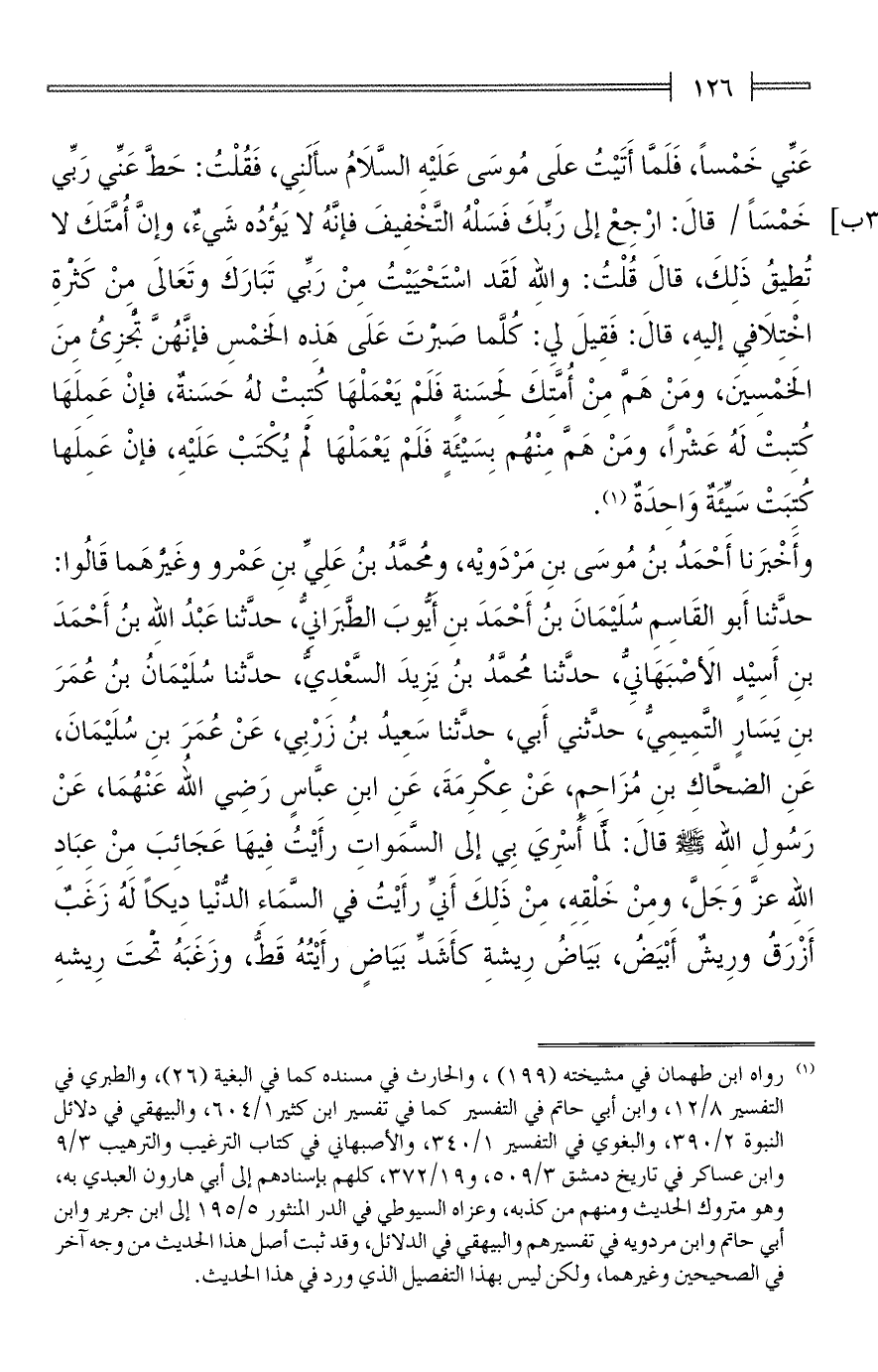 عَنِّي خَمْسًا، فَلَمَّا أَتَيْتُ علَى مُوسَى عَلَيْهِ السَّلَامُ سأَلَنِي، فَقُلْتُ: حَطَّ عَنِّي رَبِّي خَمْسًا قالَ: ارْجِعْ إلى رَبِّكَ فَسَلْهُ التَّخْفِيفَ فإنَّهُ لا يَؤُدُه شَيءٌ، وإنَّ أُمَّتَكَ لا تُطِيقُ ذَلِكَ، قالَ قُلْتُ: والله لَقَد اسْتَحْيَيْتُ مِنْ رَبِّى تَبَارَكَ وتَعَالىَ مِنْ كَثْرةِ اخْتِلَافي إليهِ، قالَ: فَقِيلَ لي: كُلَّما صَبْرتَ عَلَى هَذِه الخَمْسِ فإنَّهُنَّ تجزِئُ مِنَ الخَمْسِينَ، ومَنْ هَمَّ مِنْ أُمَّتِكَ لِحَسَنةٍ فَلَمْ يَعْمَلْهَا كُتِبتْ لهُ حَسَنةٌ، فإنْ عَمِلَهَا كُتِبتْ لَهُ عَشْرًا، ومَنْ هَمَّ مِنْهُم بِسَيْئَةٍ فَلَمْ يَعْمَلْهَا لم يُكْتَبْ عَلَيْهِ، فإنْ عَمِلَها كُتِبَتْ سَيِّئَةٌ وَاحِدَةٌ (¬1).