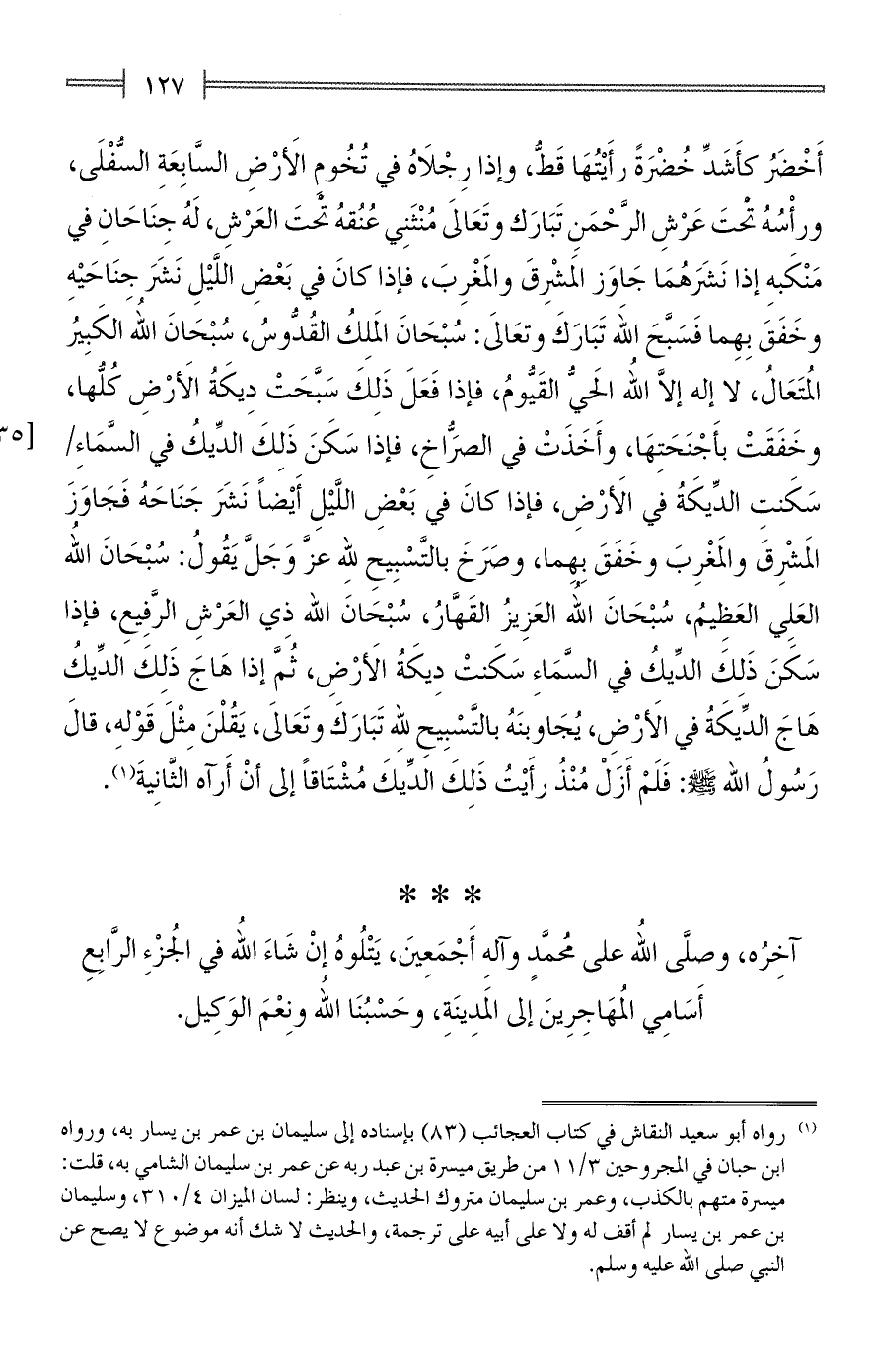 أَخْضَرُ كأَشَدِّ خُضْرَةً رأَيْتُهَا قَطُّ، وإذا رِجْلَاهُ في تُخُومِ الأَرْضِ السَّابِعَةِ السُّفْلَى، ورأْسُهُ تحْتَ عَرْشِ الرَّحْمَنِ تَبَارَك وتَعَالىَ مُنْثَنِي عُنُقهُ تْحتَ العَرْشِ، لَهُ جِنَاحَانِ في مَنْكَبهِ إذا نَشَرَهُمَا جَاوَز المَشْرِقَ والمَغْرِبَ، فإذا كانَ في بَعْضِ اللَّيْلِ نَشَرَ جِنَاحَيْهِ وخَفَقَ بِهِما فَسَبَّحَ اللهِ تَبَارَكَ وتعَالىَ: سُبْحَانَ المَلِكُ القُدُّوسُ، سُبْحَانَ اللهِ الكَبِيرُ المُتَعَالُ، لا إله إلَّا الله الحَيُّ القَيُّومُ، فإذا فَعَلَ ذَلِكَ سَبَّحَتْ دِيكَةُ الأَرْضِ كُلُّها، وخَفَقَتْ بأَجْنَحَتِهَا، وأَخَذَتْ في الصُّرَاخِ، فإذا سَكَنَ ذَلِكَ الدِّيكُ في السَّمَاءِ سَكَنتِ الدِّيكَةُ في الأَرْضِ، فإذا كانَ في بَعْضِ اللَّيْلِ أَيْضًا نَشَرَ جَنَاحَهُ فَجَاوَزَ المَشْرِقَ والمَغْرِبَ وخَفَقَ بِهِما، وصَرَخَ بالتَّسْبِيحِ للهِ عزَّ وَجَلَّ يَقُولُ: سُبْحَانَ اللهُ العَلِي العَظِيمُ، سُبْحَانَ اللهِ العَزِيزُ القَهَّارُ، سُبْحَانَ اللهِ ذِي العَرْشِ الرَّفِيعِ، فإذا سَكَنَ ذَلكَ الدِّيكُ في السَّمَاءِ سكَنتْ دِيكَةُ الأَرْضِ، ثُمَّ إذا هَاجَ ذَلِكَ الدِّيكُ هَاجَ الدِّيكَةُ في الأَرْضِ، يُجَاوبِنَهُ بالتَّسْبِيحِ للِّه تَبَارَكَ وتَعَالىَ، يَقُلْنَ مِثْلَ قَوْله، قالَ رَسُولُ اللهِ - صلى الله عليه وسلم -: فَلَمْ أَزَلْ مُنْذُ رأَيْتُ ذَلِكَ الدِّيكَ مُشْتَاقًا إلى أنْ أَرآه الثَّانِيةَ (¬1).