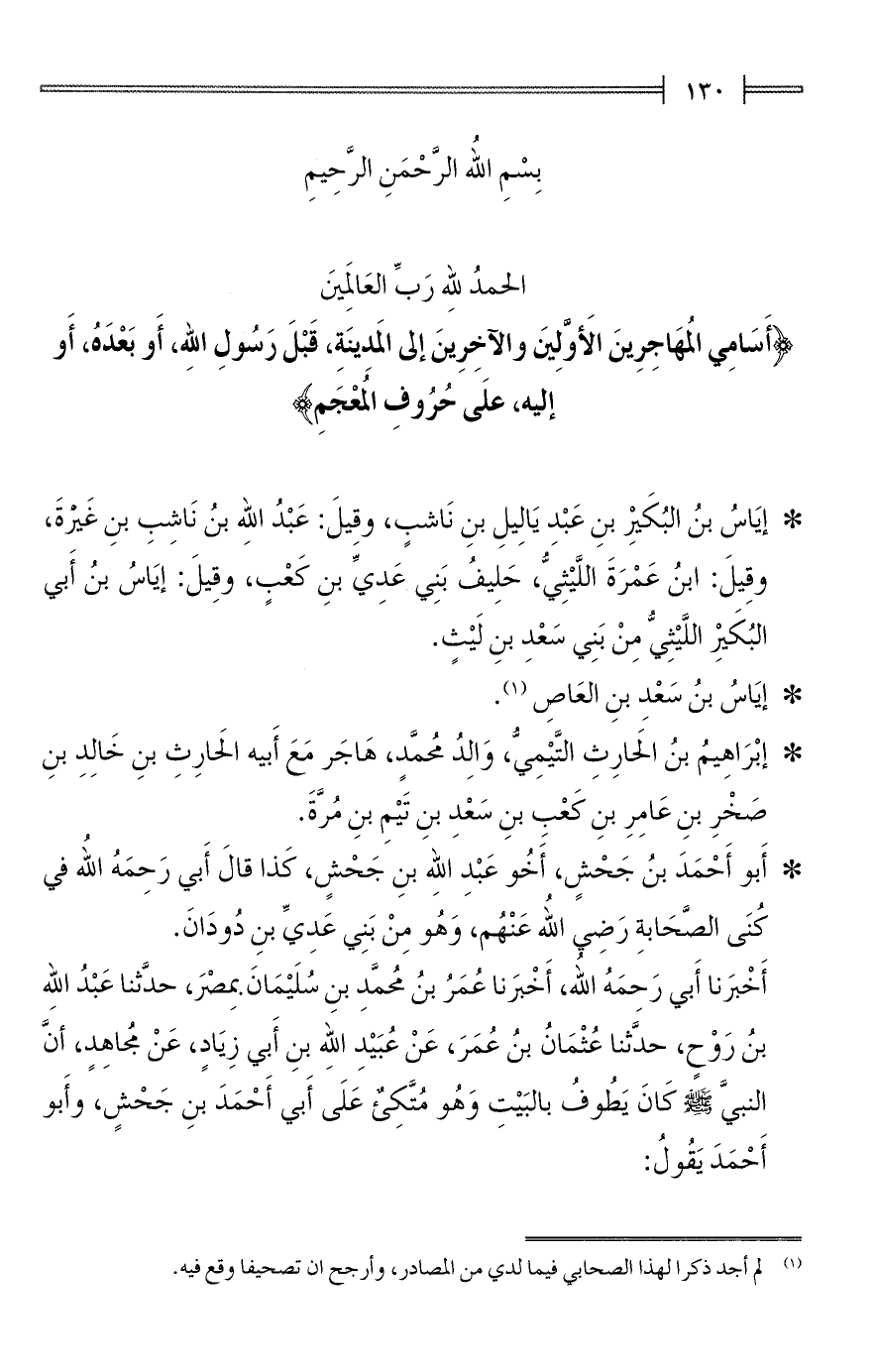 {أَسَامِي المُهَاجِرِينَ الأَوَّلِينَ والآخِرِينَ إلى المَدِينَةِ، قَبْلَ رَسُولِ اللهِ، أَو بَعْدَه، أَو إليه، علَى حُرُوفِ المُعْجَمِ}
