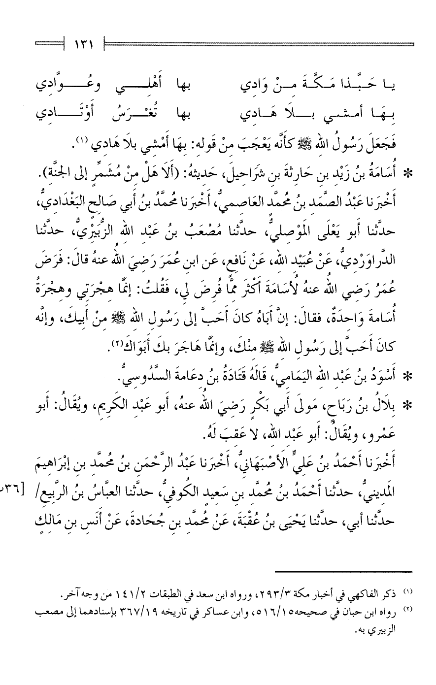 أَخْبَرنا عَبْدُ الصَّمَدِ بنُ مُحمَّدٍ العَاصِميُّ، أَخْبَرنا مُحمَّدُ بنُ أَبي صَالِحٍ البَغْدَادِيُّ، حدَّثنا أَبو يَعْلَى المَوْصِليُّ، حدَّثنا مُصْعَبُ بنُ عَبْدِ اللهِ الزُّبَيرِيُّ، حدَّثنا الدَّراوَرْدِيُّ، عَنْ عُبَيْدِ اللهِ، عَنْ نَافِعٍ، عَن ابنِ عُمَرَ رَضيَ اللهِ عنهُ قالَ: فَرَضَ عُمَرُ رَضي اللهِ عنهُ لأُسَامَةَ أَكْثرَ مِمَّا فُرِضَ لي، فَقُلتُ: إنَّما هِجْرَتِي وهِجْرَةُ أُسَامةَ وَاحدَةٌ، فقالَ: إنَّ أَبَاهُ كانَ أَحَبَّ إلى رَسُولِ اللهِ - صلى الله عليه وسلم - مِنْ أَبِيكَ، وإنَّه كانَ أَحبَّ إلى رَسُولِ اللهِ - صلى الله عليه وسلم - مِنْكَ، وإنَّمَا هَاجَرَ بكَ أَبَوَاكَ (¬2).