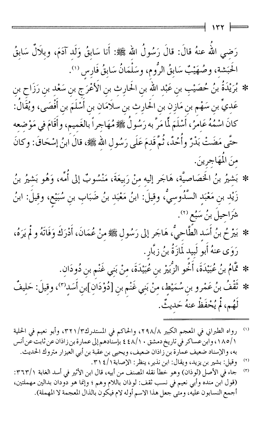 * بُرَيْدَةُ بنُ حُصَيْبِ بنِ عَبْدِ اللهِ بنِ الحَارِثِ بنِ الأَعْرَجِ بنِ سَعْدِ بنِ رَزَاحِ بنِ عَدِيِّ بنِ سَهْمِ بنِ مَازِنِ بنِ الحَارِثِ بنِ سلَامَانِ بنِ أَسْلَمَ بنِ أَفْصَى، ويُقَالُ: كانَ اسْمُهُ عَاِمرُ، أَسْلَمَ لمَّا مَرَّ به رَسُولُ الله - صلى الله عليه وسلم - مُهَاجِرًا بالغَمِيمِ، وأَقَامَ في مَوْضِعِه حتَّى مَضَتْ بَدْرٌ وأُحُدٌ، ثُمَّ قَدِمَ عَلَى رَسُولِ اللهِ - صلى الله عليه وسلم -، قالَ ابنُ إسْحَاقَ: وكانَ مِنَ المُهَاجِرِينَ.