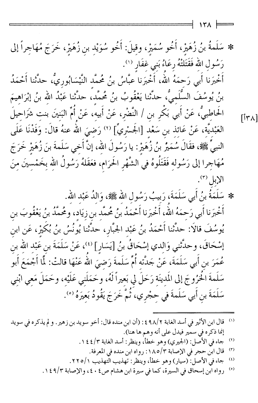 أَخْبَرنا أَبي رَحِمَهُ اللهُ، أَخْبَرنا عبَّاسُ بنُ مُحمَّدٍ النَّيْسَابُورِيُّ، حدَّثنا أَحْمَدُ بنُ يُوسُفَ السُّلَمِيُّ، حدَّثنا يَعْقُوبُ بنُ مُحمَّدٍ، حدَّثنا عَبْدُ اللهِ بنُ إبْرَاهِيمَ الحَاطِبيُّ، عَنْ أَبي بَكْرِ بنِ النَّضْرِ، عَنْ أَبيهِ، عَنْ أُمِّ البَنِينَ بنتِ شَرَاحِيلَ العَبْدِيَّةِ، عَنْ عَائِذِ بنِ سَعْدٍ [الجَسرِيِّ] (¬2) رَضِيَ اللهِ عنهُ قالَ: وَفَدْنَا عَلَى النبيِّ - صلى الله عليه وسلم -، فقَالَ سُمَير بنُ زُهَيْرٍ: يا رَسُولَ اللهِ، إنَّ أَخِي سَلَمةَ بنَ زُهَيْرٍ خَرَجَ مُهَاجِرا إلى رَسُولهِ فَقَتَلُوهُ في الشَّهْرِ الحَرَامِ، فعَقَلهُ رَسُولُ اللهِ بِخَمْسِينَ مِنَ الإبِلِ (¬3).