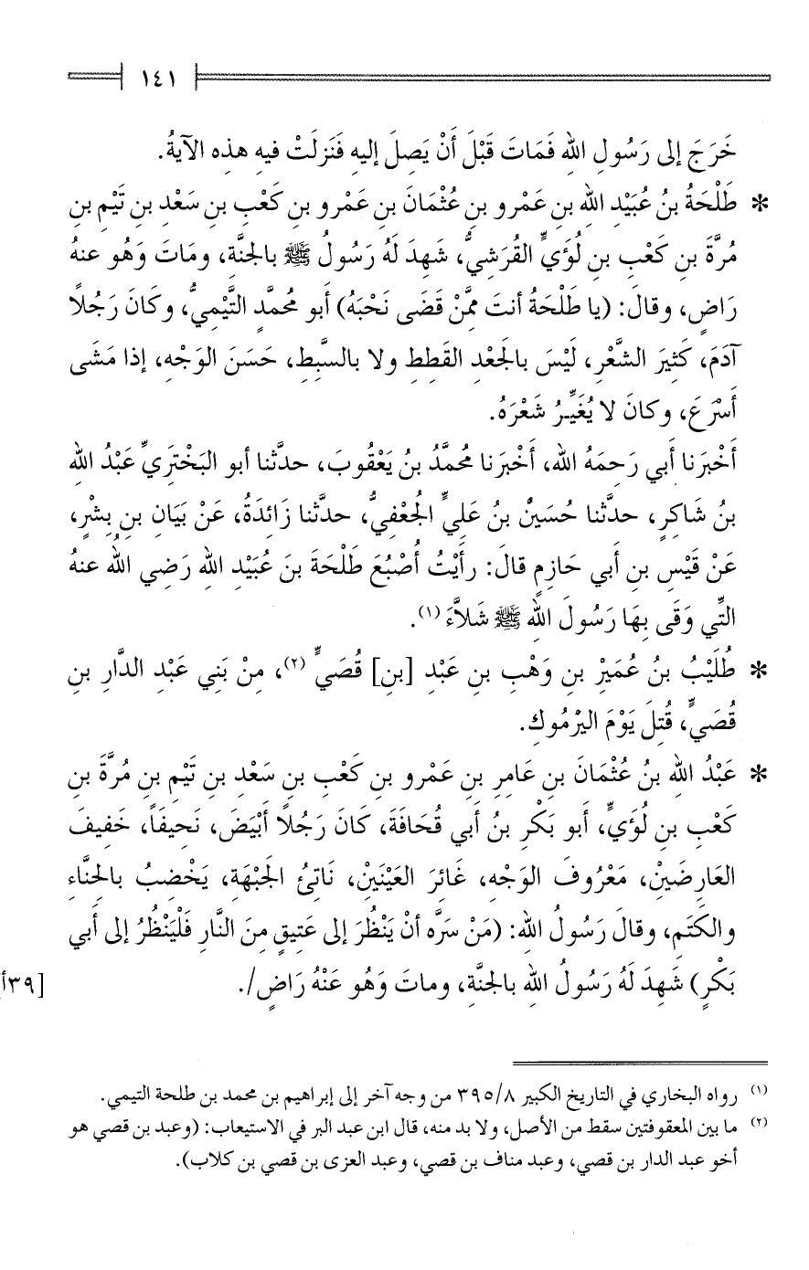 * طَلْحَةُ بنُ عُبَيْدِ اللهِ بنِ عَمْرو بنِ عُثْمَانَ بنِ عَمْرو بنِ كَعْبِ بنِ سَعْدِ بنِ تَيْمِ بنِ مُرَّةَ بنِ كَعْبِ بنِ لُؤَيٍّ القُرَشِيُّ، شَهِدَ لَهُ رَسُولُ - صلى الله عليه وسلم - بالجَنَّة، ومَاتَ وَهُو عنهُ رَاضٍ، وقالَ: (يا طَلْحَةُ أنتَ مِمَّنْ قَضَى نَحْبَهُ) أَبو مُحمَّدٍ التَّيْمِيُّ، وكَانَ رَجُلًا آدَمَ، كَثِيرَ الشَّعْرِ، لَيْسَ بالجَعْدِ القَطِطِ ولا بالسَّبِطِ، حَسَنَ الوَجْهِ، إذا مَشَى أَسْرَعَ، وكانَ لا يُغَيِّرُ شَعْرَهُ.