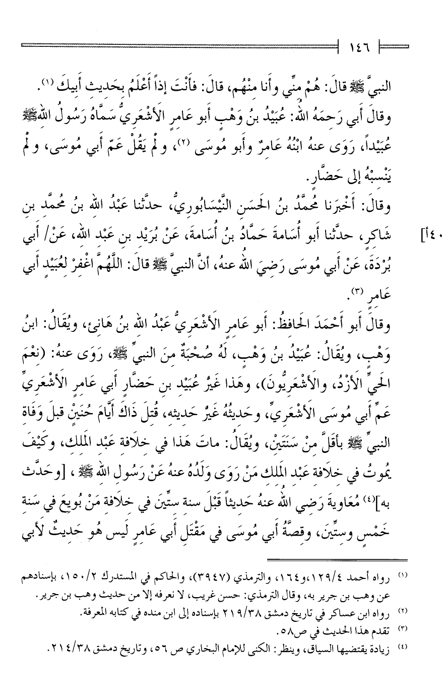 وقالَ: أَخْبَرنا مُحمَّدُ بنُ الحَسَنِ النَّيْسَابُورِيُّ، حدَّثنا عَبْدُ اللهِ بنُ مُحمَّدِ بنِ شَاكِرٍ، حدَّثنا أَبو أُسَامةَ حَمَّادُ بنُ أُسَامةَ، عَنْ بُرَيْدِ بنِ عَبْد اللهِ، عَنْ أَبي بُرْدَةَ، عَنْ أَبي مُوسَى رَضِيَ اللهُ عنهُ، أنَّ النبيَّ - صلى الله عليه وسلم - قالَ: اللَّهُمَّ اغْفِرْ لِعُبَيْدٍ أَبي عَامِرٍ (¬3).