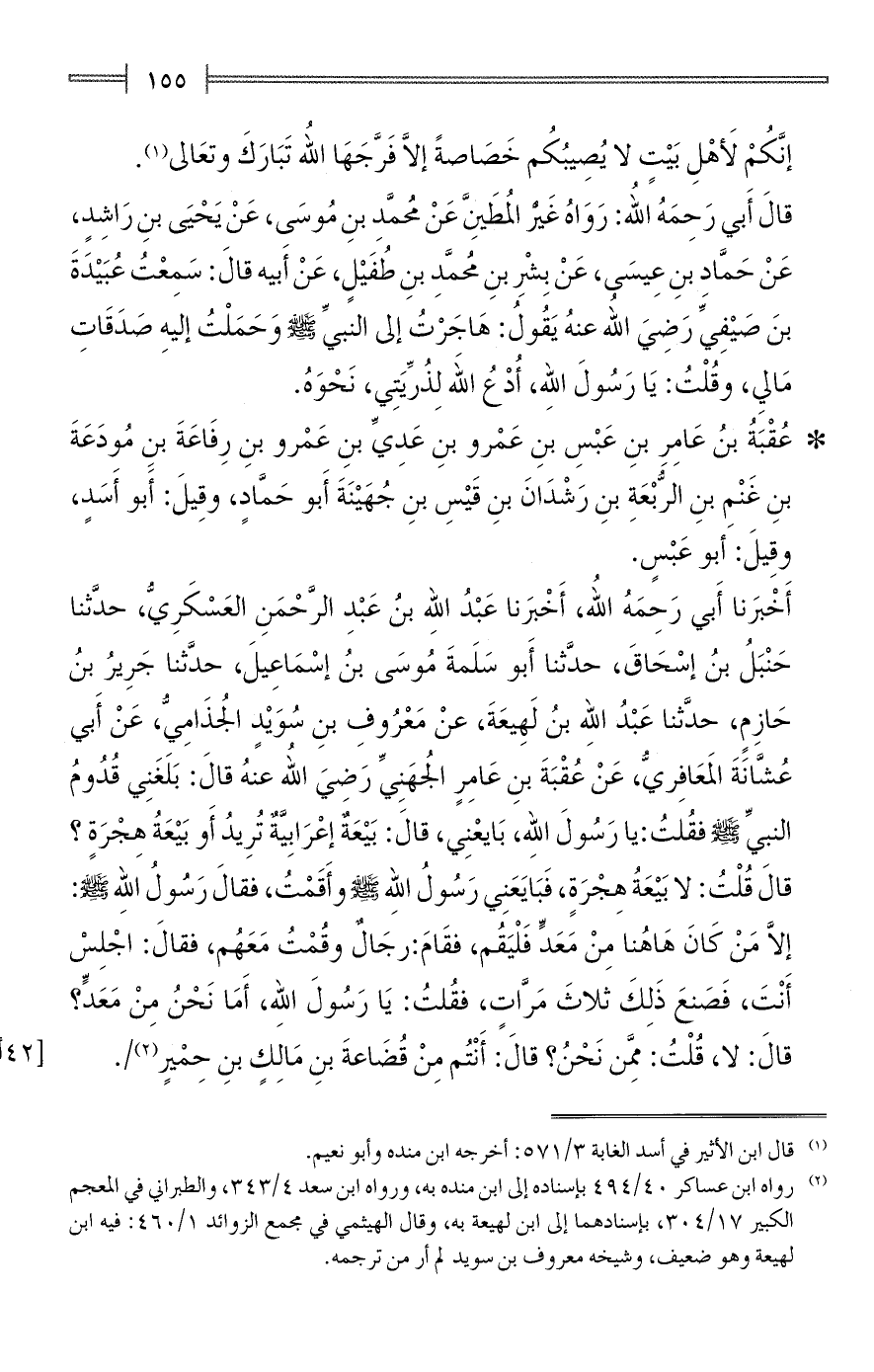 أَخْبَرنا أَبي رَحِمَهُ اللهُ، أَخْبَرنا عَبْدُ اللهِ بنُ عَبْدِ الرَّحْمَنِ العَسْكَرِيُّ، حدَّثنا حَنْبَلُ بنُ إسْحَاقَ، حدَّثنا أَبو سَلَمةَ مُوسَى بنُ إسْمَاعِيلَ، حدَّثنا جَرِيرُ بنُ حَازِمٍ، حدَّثنا عَبْدُ اللهِ بنُ لَهِيعَةَ، عنْ مَعْرُوفِ بنِ سُوَيْدٍ الجُذَامِيُّ، عَنْ أَبي عُشَّانَةَ المَعَافِريُّ، عَنْ عُقْبَةَ بنِ عَامِرٍ الجُهَنِيِّ رَضِيَ اللهُ عنهُ قالَ: بَلَغَنِي قُدُومُ النبيِّ - صلى الله عليه وسلم - فقُلتُ: يا رَسُولَ اللهِ، بَايعْنِي، قالَ: بَيْعَةٌ أعْرَابِيَّةٌ تُرِيدُ أَو بَيْعَةُ هِجْرَةٍ؟ قالَ قُلْتُ: لا بَيْعَةُ هِجْرَةٍ، فَبَايَعَنِي رَسُولُ اللهِ - صلى الله عليه وسلم - وأَقَمْتُ، فقالَ رَسُولُ اللهِ - صلى الله عليه وسلم -: إلَّا مَنْ كَانَ هَاهُنا مِنْ مَعَدِّ فَلْيَقُم، فقَامَ: رجَالٌ وقُمْتُ مَعَهُم، فقالَ: اجْلِسْ أَنْتَ، فَصَنعَ ذَلِكَ ثلاثَ مَرَّاتٍ، فقُلتُ: يَا رَسُولَ اللهِ، أَمَا نَحْنُ مِنْ مَعَدٍّ؟ قالَ: لا، قُلْتُ: مِمَّن نَحْنُ؟ قالَ: أَنْتُم مِنْ قُضَاعةَ بنِ مَالِكٍ بنِ حِمَيرٍ (¬2).