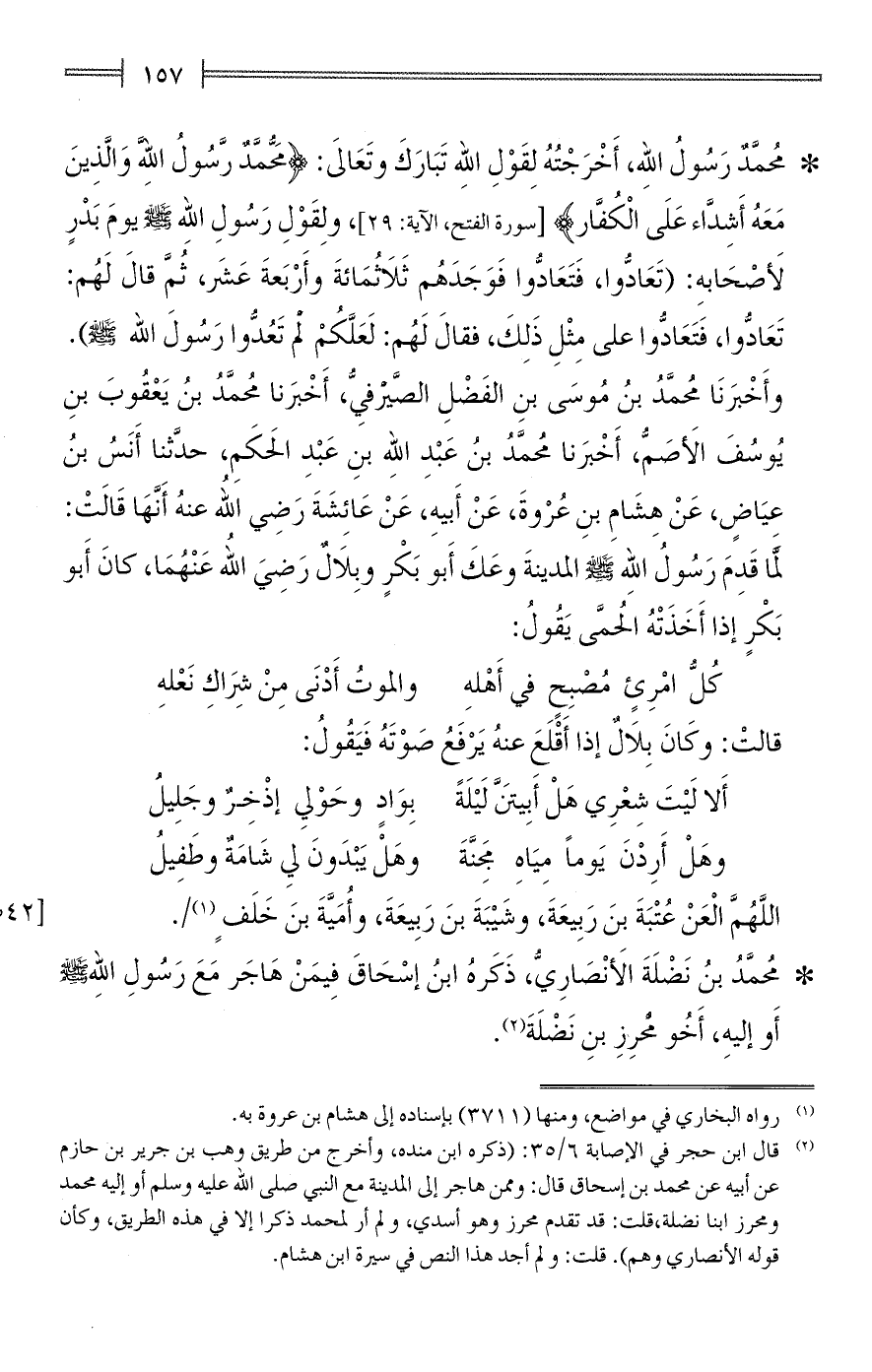 وأَخْبَرنَا مُحمَّدُ بنُ مُوسَى بنِ الفَضْلِ الصَّيرَفيُّ، أَخْبَرنا مُحمَّدُ بنُ يَعْقُوبَ بنِ يُوسُفَ الأَصَمُّ، أَخْبَرنا مُحمَّدُ بنُ عَبْدِ الله بنِ عَبْدِ الحَكَمِ، حدَّثنا أَنَسُ بنُ عِيَاضٍ، عَنْ هِشَامِ بنِ عُرْوةَ، عَنْ أَبيهِ، عَنْ عَائِشَةَ رَضِي الله عنهُ أَنَّهَا قَالَتْ: لمَّا قَدِمَ رَسُولُ اللهِ - صلى الله عليه وسلم - المدينةَ وعَكَ أَبو بَكْرٍ وبِلَالٌ رَضِيَ الله عَنْهُمَا، كانَ أَبو بَكْرٍ إذا أَخَذَتْهُ الحُمَّى يَقُولُ: