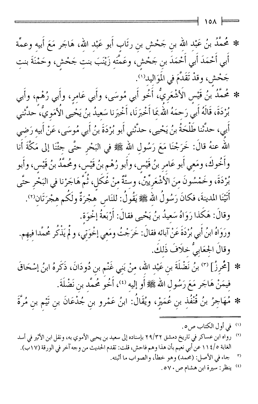 * مُحمَّدُ بنُ قَيْسٍ الأَشْعَرِيُّ، أَخُو أَبي مُوسَى، وأَبي عَامِرٍ، وأَبى رُهْمٍ، وأَبي بُرْدَةَ، قَالَهُ أَبي رَحِمَهُ الله بِمَا أَخْبَرنَا، أَخْبَرنا سَعِيدُ بنُ يَحْيى الأُمَوِيُّ، حدَّثني أَبي، حدَّثنا طَلْحَةُ بنُ يَحْيى، حدَّثني أَبو بُرْدَةَ بنُ أَبي مُوسَى، عَنْ أَبيهِ رَضِي الله عنهُ قالَ: خَرَجْنَا مَعَ رَسُولِ اللهِ - صلى الله عليه وسلم - في البَحْرِ حتَّى جِئْنَا إلى مَكَّةَ أَنا وأَخُوكَ، ومَعِي أَبو عَامِرِ بنُ قَيْسٍ، وأَبو رُهْم بنُ قَيْسٍ، ومُحمَّدُ بنُ قَيْسٍ، وأَبو بُرْدَةَ، وخَمْسُونَ مِنَ الأَشْعَرِيِّينْ، وسِتَّةٌ مِنْ عُكَلٍ، ثُمَّ هَاجَرْنا في البَحْرِ حتَّى أَتَيْنَا المدينةَ، فكانَ رَسُولُ الله - صلى الله عليه وسلم - يَقُولُ: للنَاسِ هِجْرَةٌ ولَكُم هِجْرَتَانِ (¬2).