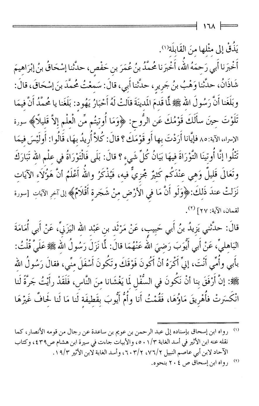 أَخْبَرنا أَبي رَحِمَهُ الله، أَخْبَرنا مُحمَّدُ بنُ عُمَرَ بنِ حَفْصٍ، حدَّثنا إسْحَاقُ بنُ إبْرَاهِيمَ شَاذَانُ، حدَّثنا وَهْبُ بنُ جَرِيرٍ، حدَّثنا أَبِى، قالَ: سَمِعْتُ مُحمَّدَ بنَ إسْحَاقَ، قالَ: وبَلَغَنا أَنَّ رَسُولَ اللهِ - صلى الله عليه وسلم - لمَّا قَدِمَ المَدينَةَ قالَتْ لَهُ أَحْبَارُ يَهُودٍ: بَلَغَنا يا مُحمَّدُ أَنَّ فِيمَا تَلَوْتَ حِينَ سأَلَكَ قَوْمُكَ عَن الرُّوحِ: {وَمَا أُوتِيتُمْ مِنَ الْعِلْمِ إِلَّا قَلِيلًا} [سورة الإسراء، الآية: 85] فإيَّانا أَرَدْتَ بِها أَو قَوْمَكَ؟ قالَ: كُلَّا أُرِيدُ بِهَا، قَالُوا: أَو لَيْسَ فِيمَا تَتْلُوا إنَّا أُوتِينَا التَّوْرَاةَ فِيهَا بَيَانُ كُلِّ شَيءٍ؟ قالَ: بَلَى فَالْتَوْرَاةُ في عِلْمِ اللهِ تَبَارَكَ وتَعَالىَ قَلِيلٌ وَهِي عِنْدَكُم كَثِيرٌ مجزِيٌّ فيهِ، فَيُذْكَرُ واللُّه أَعْلَمُ أنَّ هَؤُلَاءِ الآيَاتِ نَزَلتْ عندَ ذَلِكَ: {وَلَوْ أَنَّمَا فِي الْأَرْضِ مِنْ شَجَرَةٍ أَقْلَامٌ} إلى آخِرِ الآيَاتِ [سورة لقمان، الآية:27] (¬2).