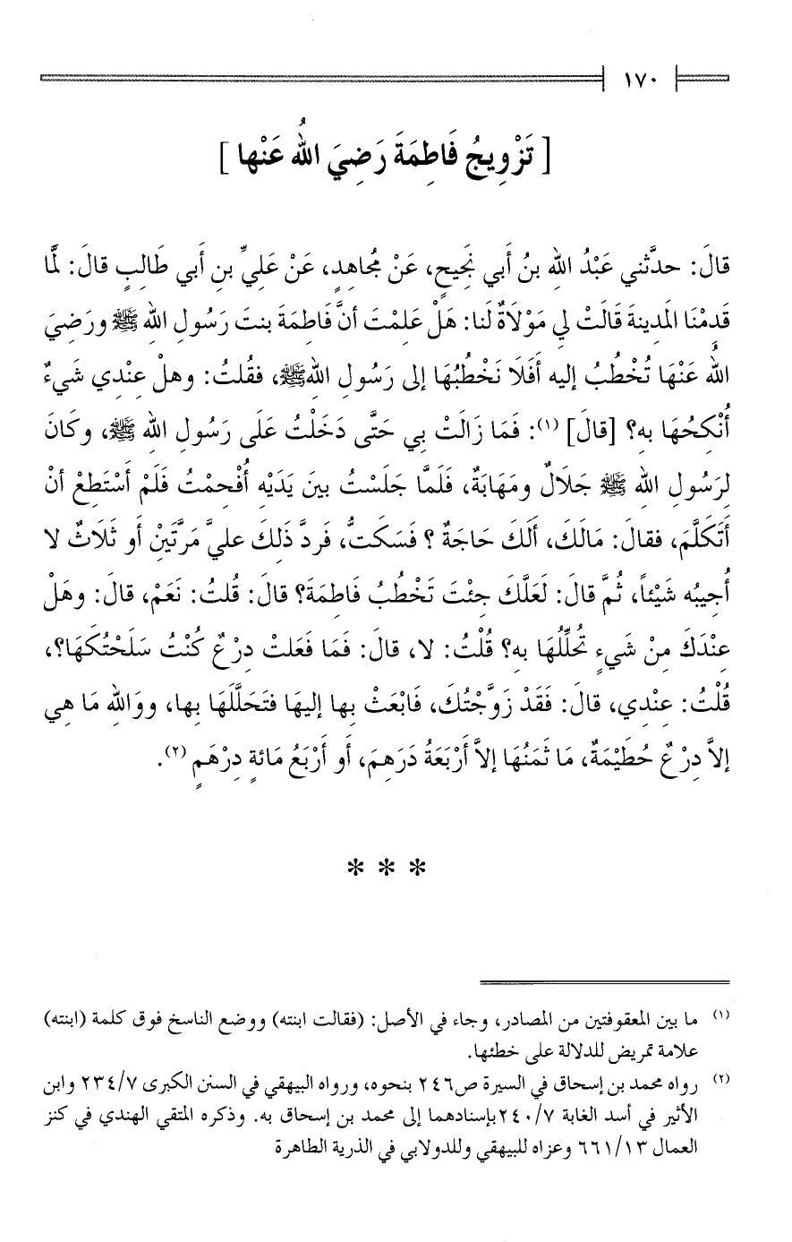 قالَ: حدَّثني عَبْدُ الله بنُ أَبي نَجِيحٍ، عَنْ مُجاهِدٍ، عَنْ عَلِيِّ بنِ أَبي طَالِبٍ قالَ: لمَّا قَدِمْنَا المَدِينةَ قَالَتْ لي مَوْلَاةٌ لَنا: هَلْ عَلِمْتَ أنَّ فَاطِمَةَ بنتَ رَسُولِ اللهِ - صلى الله عليه وسلم - ورَضِيَ اللهُ عَنْهَا تُخْطُبُ إليه أَفَلَا نَخْطُبُهَا إلى رَسُولِ الله - صلى الله عليه وسلم -، فقُلتُ: وهلْ عِنْدِي شَيءٌ أُنْكِحُهَا به؟ [قالَ] (¬1): فَمَا زَالَتْ بِي حَتَّى دَخَلْتُ عَلَى رَسُولِ الله - صلى الله عليه وسلم -، وكَانَ لِرَسُولِ الله - صلى الله عليه وسلم - جَلَالٌ ومَهَابَةٌ، فَلَمَّا جَلَسْتُ بينَ يَدَيْهِ أُفْحِمْتُ فَلَمْ أَسْتَطِعْ أنْ أَتَكَلَّمَ، فقالَ: مَالَكَ، أَلَكَ حَاجَةٌ؟ فَسَكَتُّ، فَردَّ ذَلِكَ عليَّ مَرَّتَين أَو ثَلَاثٌ لا أُجِيبُه شَيْئًا، ثُمَّ قالَ: لَعَلَّكَ جِئْتَ تَخْطُبُ فَاطِمَةَ؟ قالَ: قُلتُ: نَعَمْ، قالَ: وهَلْ عِنْدَكَ مِنْ شَيءٍ تُحلِّلُهَا به؟ قُلْتُ: لا، قالَ: فَمَا فَعَلتْ دِرْعٌ كُنْتُ سَلَحْتُكَهَا؟، قُلْتُ: عِنْدِي، قالَ: فَقَدْ زَوَّجْتُكَ، فَابْعَثْ بِها إليهَا فتَحَلَّلَهَا بِها، ووَاللهِ مَا هِي إلَّا دِرْعٌ حُطَيْمَةٌ، مَا ثَمَنُهَا إلَّا أَرْبَعَةُ دَرَهِمَ، أَو أَرْبَعُ مَائةٍ دِرْهَمٍ (¬2).