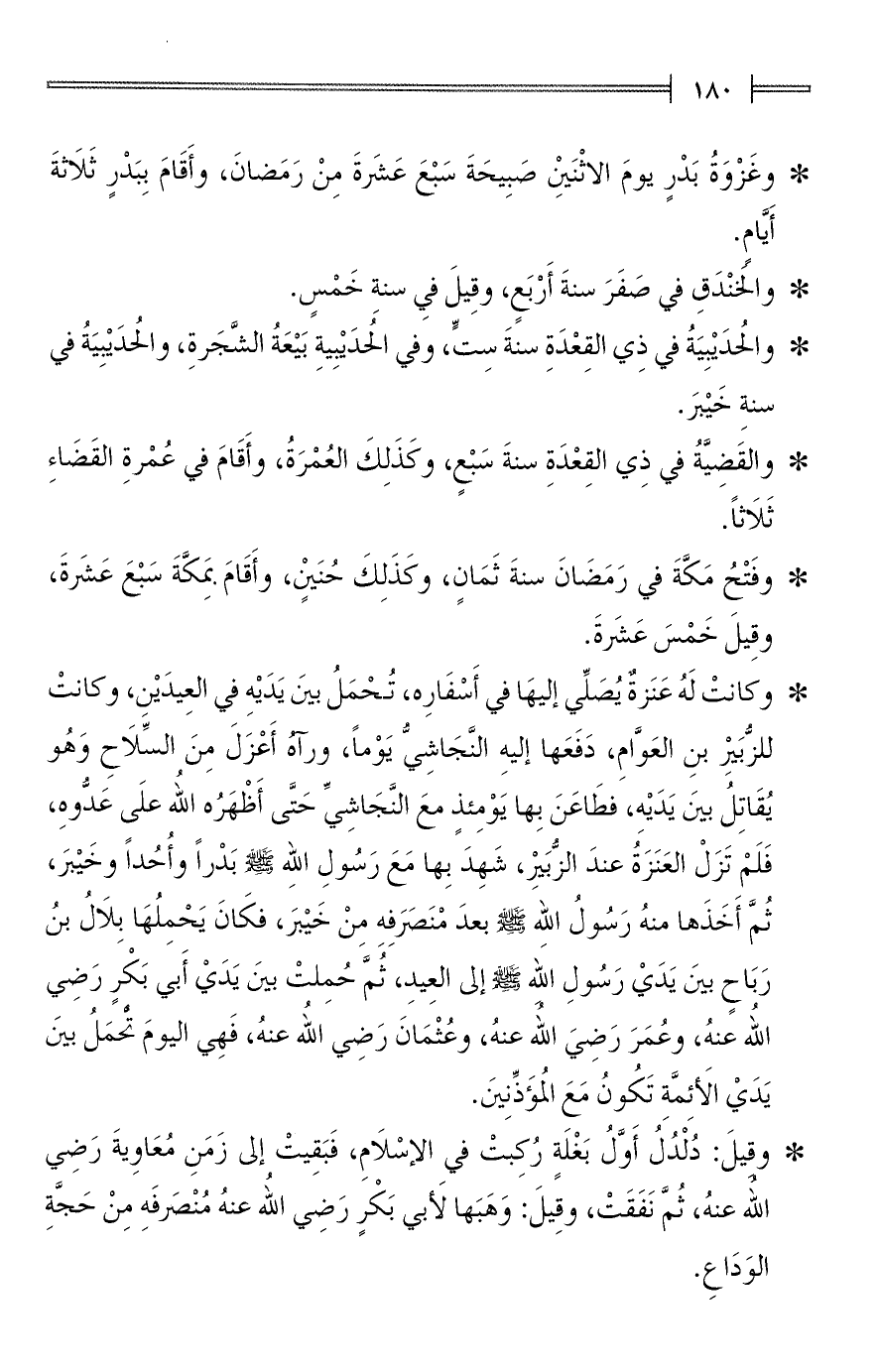 * وغَزْوَةُ بَدْرٍ يومَ الاثنَينِ صَبِيحَةَ سَبْعَ عَشَرةَ مِنْ رَمَضانَ، وأَقَامَ بِبَدْرٍ ثَلَاثةَ أَيَّامٍ.