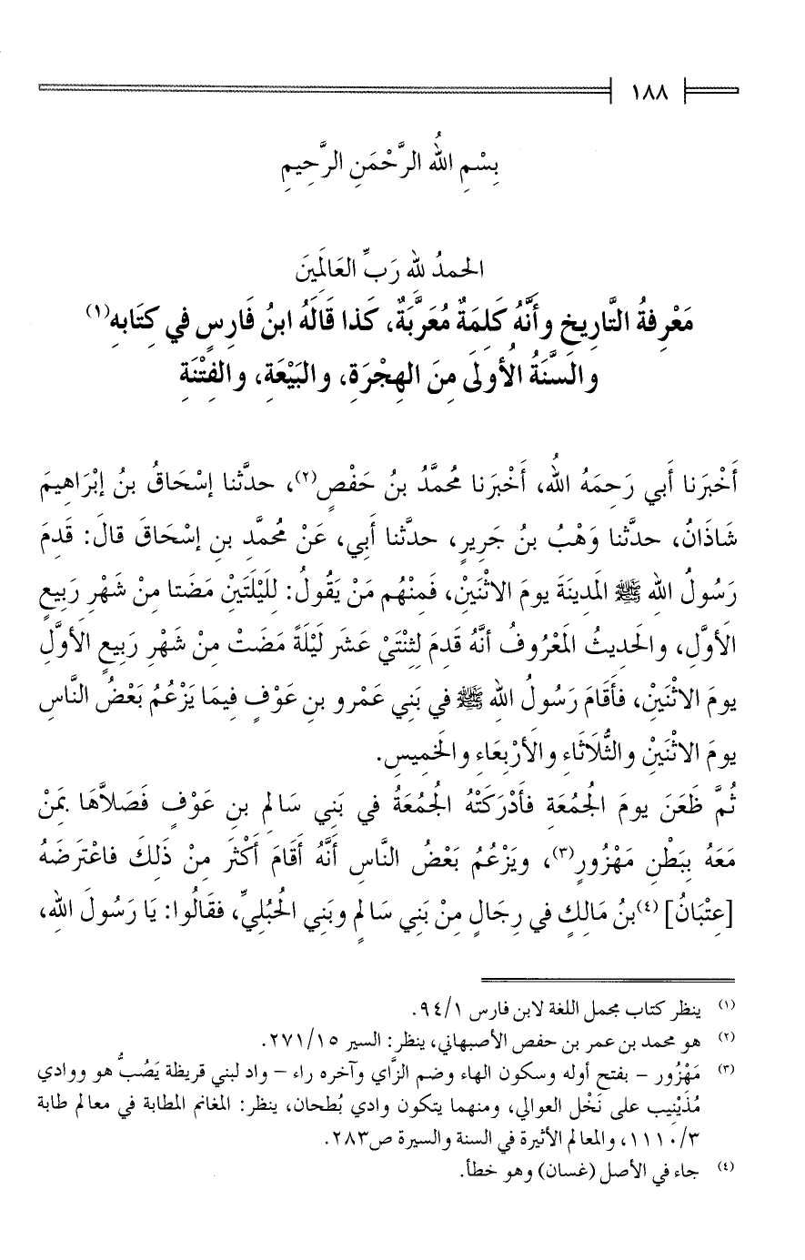 مَعْرِفةُ التَّارِيخ وأنَّهُ كَلِمَةٌ مُعَرَّبَةٌ، كَذا قَالَهُ ابنُ فَارِسٍ في كِتَابهِ (¬1) والَسَّنَةُ الأُولىَ مِنَ الهِجْرَةِ، والبَيْعَةِ، والفِتْنَةِ