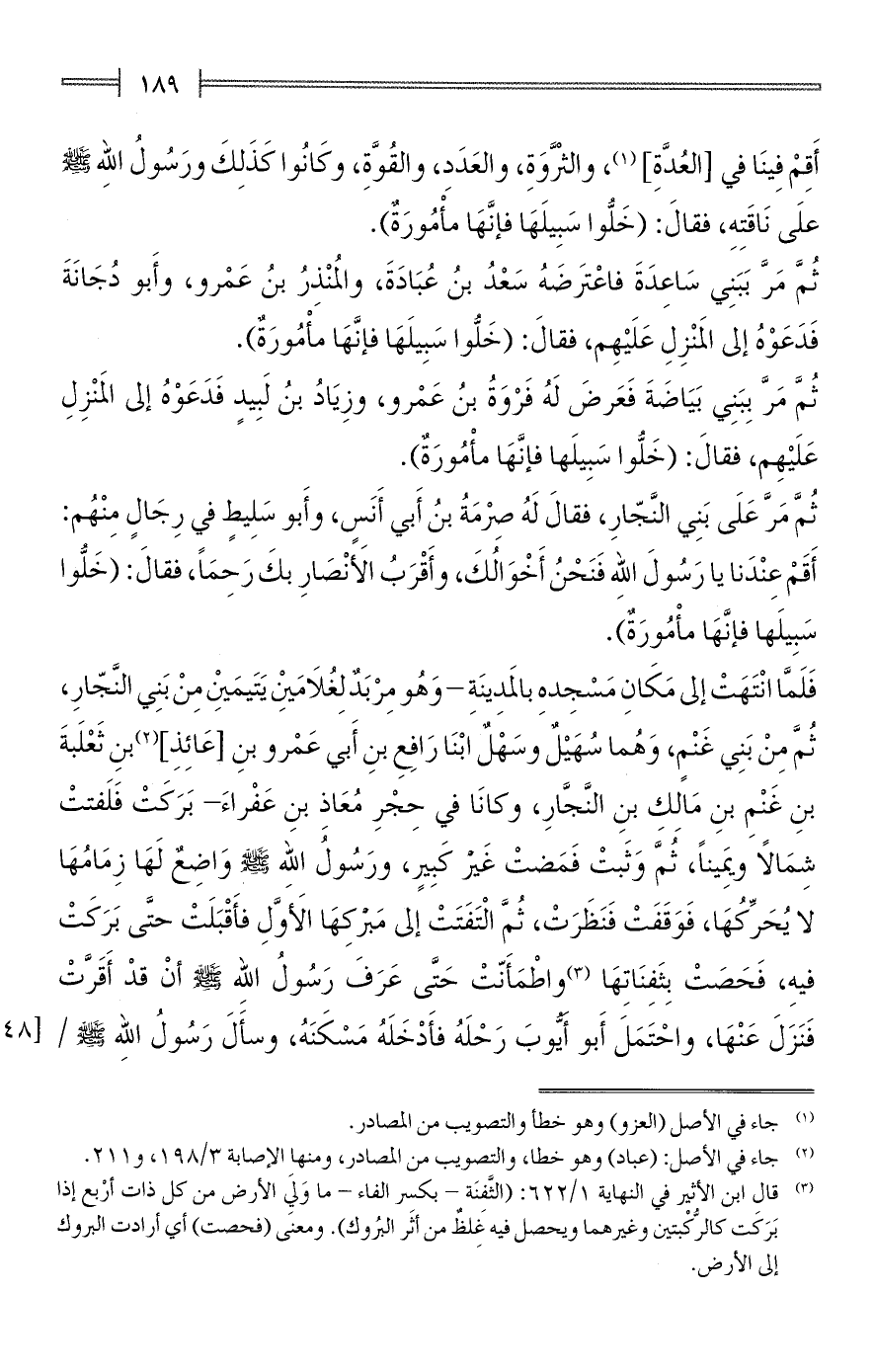 فَلَمَّا انْتَهَتْ إلى مَكَانِ مَسْجِدهِ بالمَدِينَةِ -وَهُو مِرْبَدٌ لِغُلَامَين يَتَيمَين مِنْ بَنِي النَّجّارِ، ثُمَّ مِنْ بَنِي غَنْمٍ، وَهُما سُهَيْلٌ وسَهْلٌ ابْنَا رَافِعِ بنِ أَبي عَمْرو بنِ [عَائِذِ] (¬2) بنِ ثَعْلَبةَ بنِ غَنْمِ بنِ مَالِكِ بنِ النَّجَّارِ، وكانَا في حِجْرِ مُعَاذِ بنِ عَفْراءَ- بَرَكَتْ فَلَفتتْ شِمَالًا ويَمِينًا، ثُمَّ وَثَبتْ فَمَضتْ غَير كَبِير، ورَسُولُ الله - صلى الله عليه وسلم - وَاضِعٌ لَهَا زِمَامُهَا لا يُحَرِّكُهَا، فَوَقَفَتْ فَنَظَرَتْ، ثُمَّ الْتَفَتَتْ إلى مَبْركِهَا الأَوَّلِ فأَقْبَلَتْ حتَّى بَرَكَتْ فيهِ، فَحَصَتْ بِثَفِنَاتِهَا (¬3) واطْمَأَنّتْ حَتَّى عَرَفَ رَسُولُ اللهِ - صلى الله عليه وسلم - أنْ قدْ أَقَرَّتْ فَنَزَلَ عَنْهَا، واحْتَمَلَ أَبو أَيُّوبَ رَحْلَهُ فأَدْخَلَهُ مَسْكَنَهُ، وسأَلَ رَسُولُ اللهِ - صلى الله عليه وسلم -