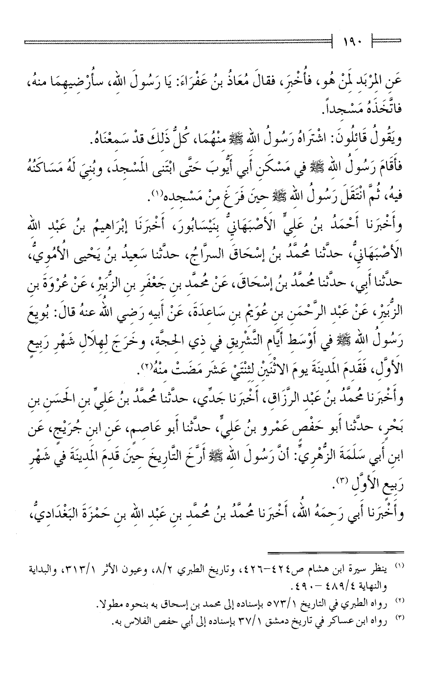 وأَخْبَرنا أَحْمَدُ بنُ عَلِيٍّ الأَصْبَهَانِيُّ بِنَيْسَابُورَ، أَخْبَرنَا إبْرَاهِيمُ بنُ عَبْدِ الله الأَصْبَهَانِيُّ، حدَّثنا مُحمَّدُ بنُ إسْحَاقَ السَّراجُ، حدَّثنا سَعِيدُ بنُ يَحْيى الأُمُوِيُّ، حدَّثنا أَبِي، حدَّثنا مُحمَّدُ بنُ إسْحَاقَ، عَنْ مُحمَّدِ بنِ جَعْفَرِ بنِ الزُّبَيِرْ، عَنْ عُرْوَةَ بنِ الزُّبَيِرْ، عَنْ عَبْدِ الرَّحْمَنِ بنِ عُوَيمِ بنِ سَاعِدَةَ، عَنْ أَبيهِ رَضي الله عنهُ قالَ: بُويِعَ رَسُولُ الله - صلى الله عليه وسلم - في أَوْسَطِ أَيَّامِ التَّشْرِيقِ في ذِي الحِجَّةِ، وخَرَجَ لِهِلَالِ شَهْرِ رَبِيعٍ الأَوَّلِ، فَقَدِمَ المَدِينَةَ يومَ الاثْنَين لِثِنْتَيْ عَشَر مَضتْ مِنْهُ (¬2).