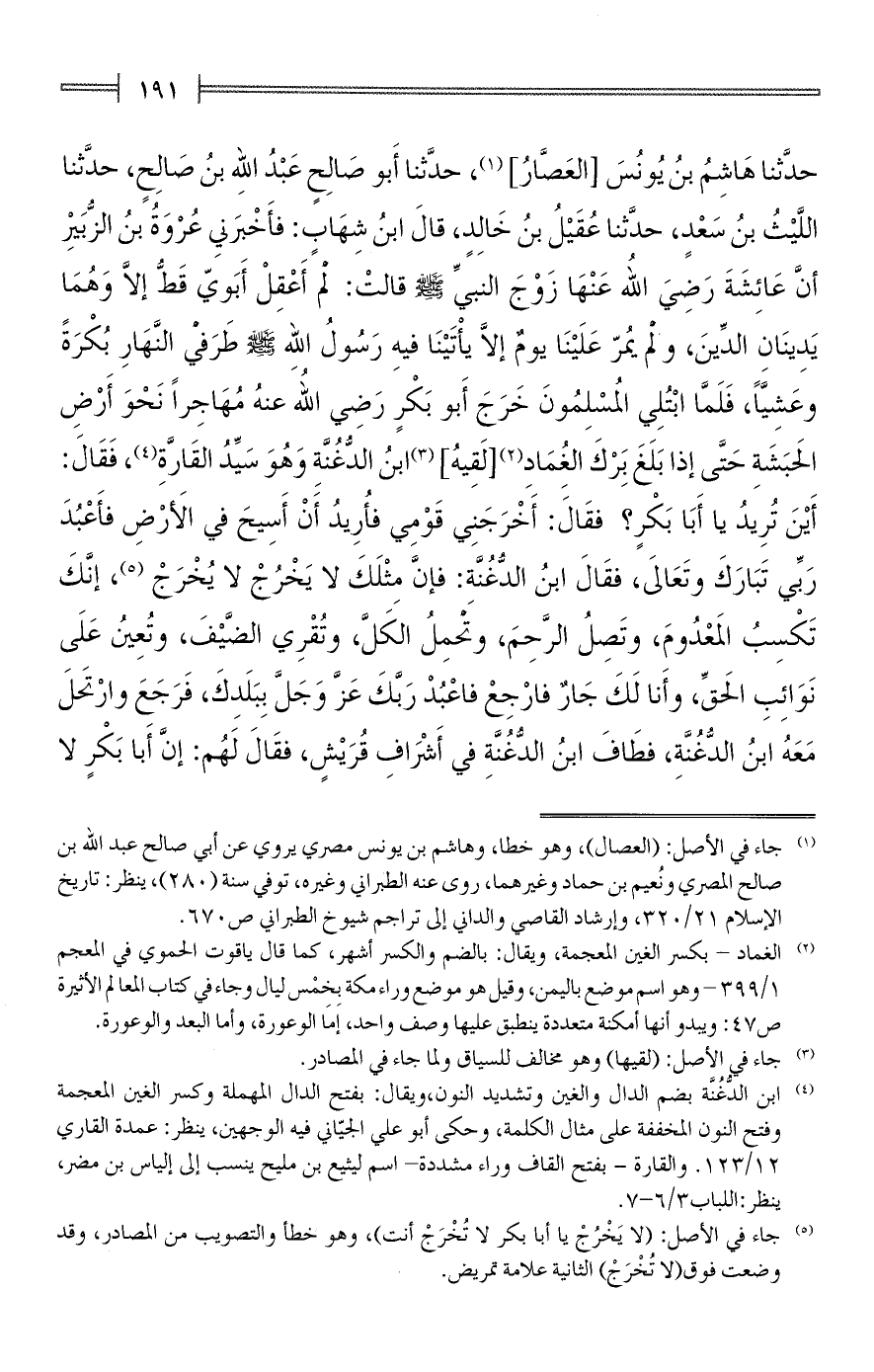 حدَّثنا هَاشِمُ بنُ يُونُسَ [العَصَّارُ] (¬1)، حدَّثنا أَبو صَالِحٍ عَبْدُ الله بنُ صَالِحٍ، حدَّثنا اللَّيْثُ بنُ سَعْدٍ، حدَّثنا عُقَيْلُ بنُ خَالِدٍ، قالَ ابنُ شِهَابٍ: فأَخْبَرنيِ عُرْوَةُ بنُ الزُّبَيْرِ أنَّ عَائِشَةَ رَضِيَ الله عَنْهَا زَوْجَ النبيِّ - صلى الله عليه وسلم - قالتْ: لمْ أَعْقِلْ أَبَويّ قَطُّ إلَّا وَهُمَا يَدِينَان الدِّينَ، ولمْ يمُرّ عَلَيْنَا يومٌ إلَّا يأْتَيْنَا فيهِ رَسُولُ الله - صلى الله عليه وسلم - طَرَفيْ النَّهَارِ بُكْرَةً وعَشِيًّا، فَلَمَّا ابْتُلِي المُسْلِمُونَ خَرَجَ أَبو بَكْرٍ رَضِي الله عنهُ مُهَاجِرًا نَحْوَ أَرْضِ الحَبَشَةِ حَتَّى إذا بَلَغَ بِرْكَ الغُمَادِ (¬2) [لَقِيهُ] (¬3) ابنُ الدُّغُنَّةِ وَهُوَ سَيِّدُ القَارَّةِ (¬4)، فَقَالَ: أَيْنَ تُرِيدُ يا أَبَا بَكْرٍ؟ فقَالَ: أَخْرَجَنِي قَوْمِي فأُرِيدُ أَنْ أَسِيحَ في الأَرْضِ فأَعْبُدَ رَبِّي تَبَارَكَ وتَعَالىَ، فقَالَ ابنُ الدُّغُنَّةِ: فإنَّ مِثْلَكَ لا يَخْرُجْ لا يُخْرَجْ (¬5)، إنَّكَ تَكْسِبُ المَعْدُومَ، وتَصِلُ الرَّحِمَ، وتحْمِلُ الكَلَّ، وتُقْرِي الضَّيْفَ، وتُعِينُ عَلَى نَوَائِبِ الحَقِّ، وأَنا لَكَ جَارٌ فارْجِعْ فاعْبُدْ رَبَّكَ عَزَّ وَجَلَّ بِبَلَدِكَ، فَرَجَعَ وارْتَحلَ مَعَهُ ابنُ الدُّغُنَّةِ، فطَافَ ابنُ الدُّغُنَّةِ في أَشْرَافِ قُرَيْشٍ، فقَالَ لَهُم: إنَّ أَبا بَكْرٍ لا