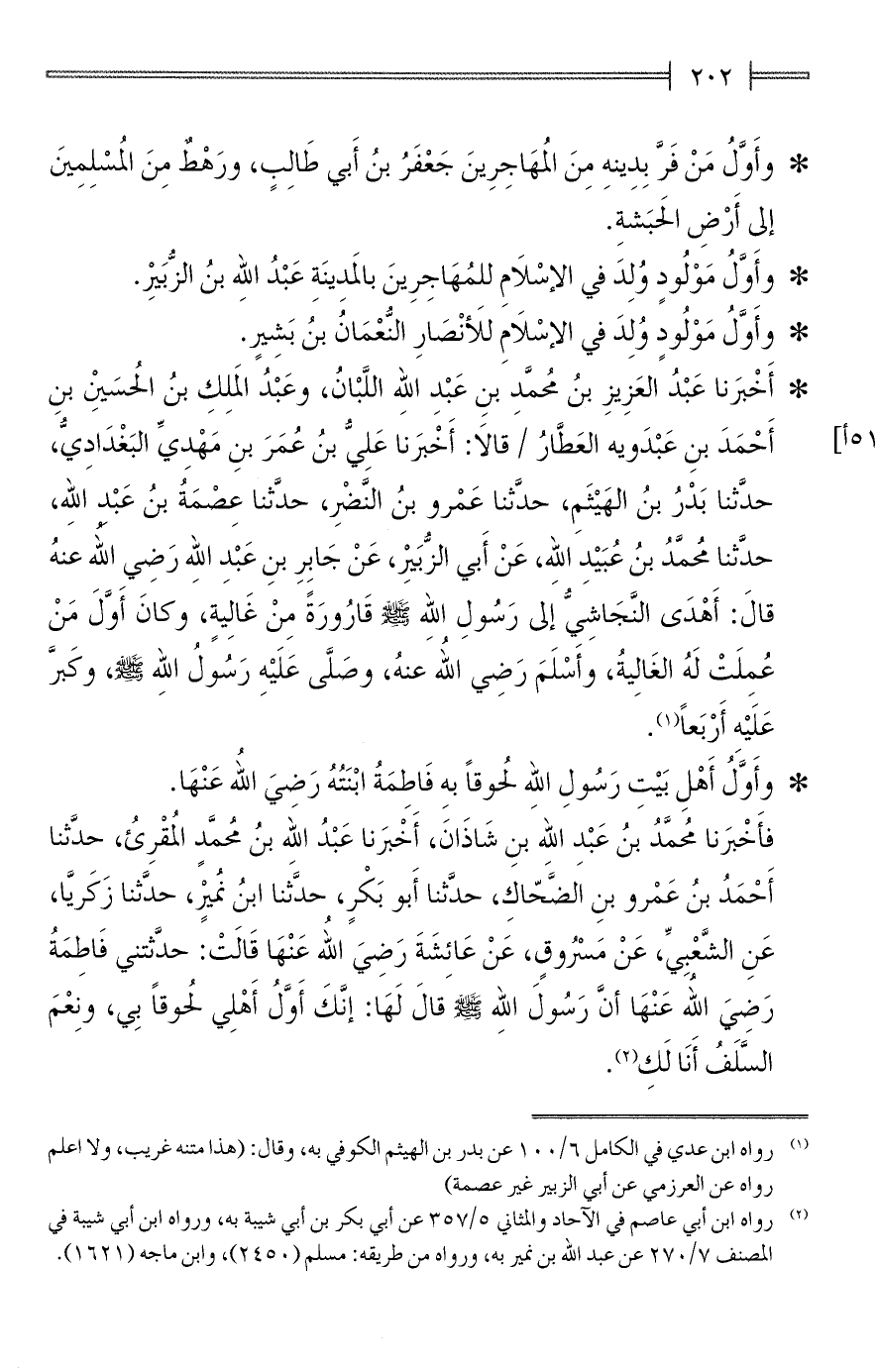 * وأَوَّلُ مَوْلُودٍ وُلِدَ في الإسْلَامِ للمُهَاجِرِينَ بالمَدِينَةِ عَبْدُ الله بنُ الزُّبَيْرِ.
