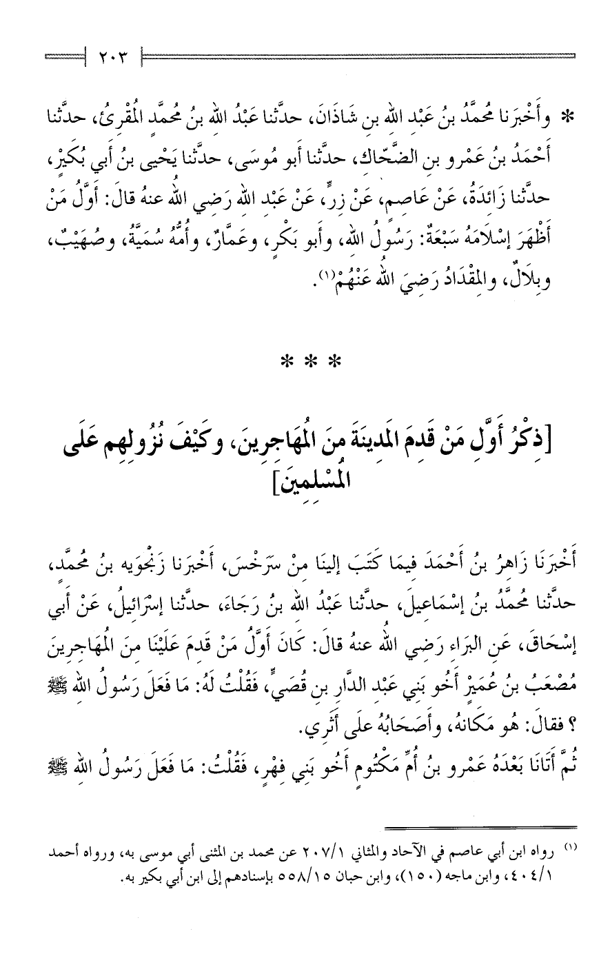 أَخْبَرنَا زَاهِرُ بنُ أَحْمَدَ فِيمَا كتَبَ إلينَا مِنْ سَرَخْسَ، أَخْبَرنا زَنجوَيه بنُ مُحمَّدٍ، حدَّثنا مُحمَّدُ بنُ إسْمَاعِيلَ، حدَّثنا عَبْدُ الله بنُ رَجَاءَ، حدَّثنا إسْرَائِيلُ، عَنْ أَبي إسْحَاقَ، عَنِ البَراءِ رَضِي الله عنهُ قالَ: كَانَ أَوَّلُ مَنْ قَدِمَ عَلَيْنَا مِنَ المُهَاجرِينَ مُصعَبُ بنُ عُمَير أَخُو بَنِي عَبْدِ الدَّارِ بنِ قُصَيٍّ، فَقُلْتُ لَهُ: مَا فَعَلَ رَسُولُ الله - صلى الله عليه وسلم -؟ فقالَ: هُو مَكَانهُ، وأَصحَابُهُ علَى أَثَرِي.