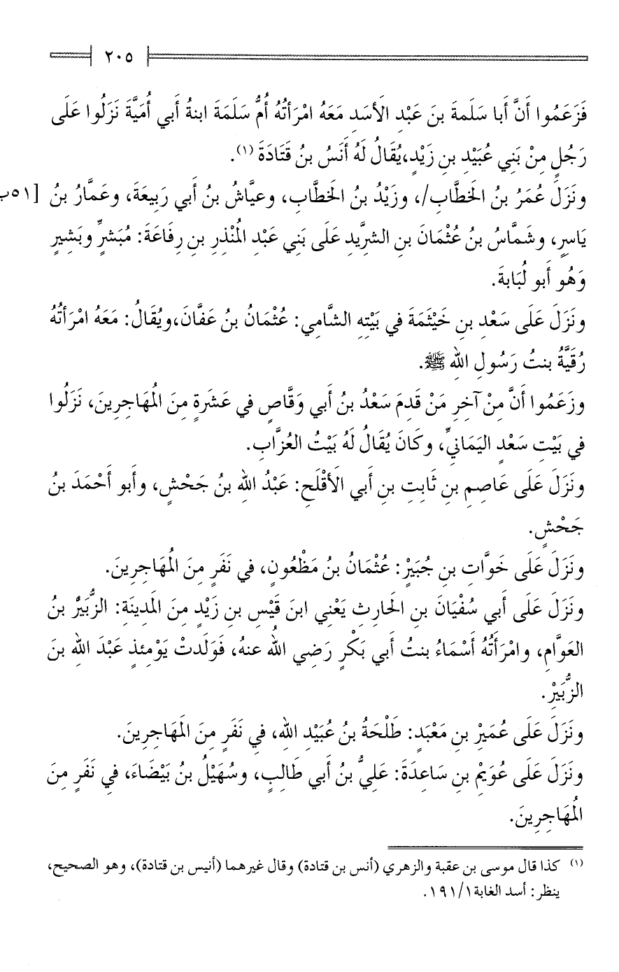 فَزَعَمُوا أَنَّ أَبا سَلَمةَ بنَ عَبْدِ الأَسَدِ مَعَهُ امْرَأتُهُ أُمُّ سَلَمَةَ ابنةُ أَبي أُمَيَّةَ نَزَلُوا عَلَى رَجُلٍ مِنْ بَنِي عُبَيْدِ بنِ زَيْدٍ، يُقَالُ لَهُ أَنَسُ بنُ قَتَادَةَ (¬1).