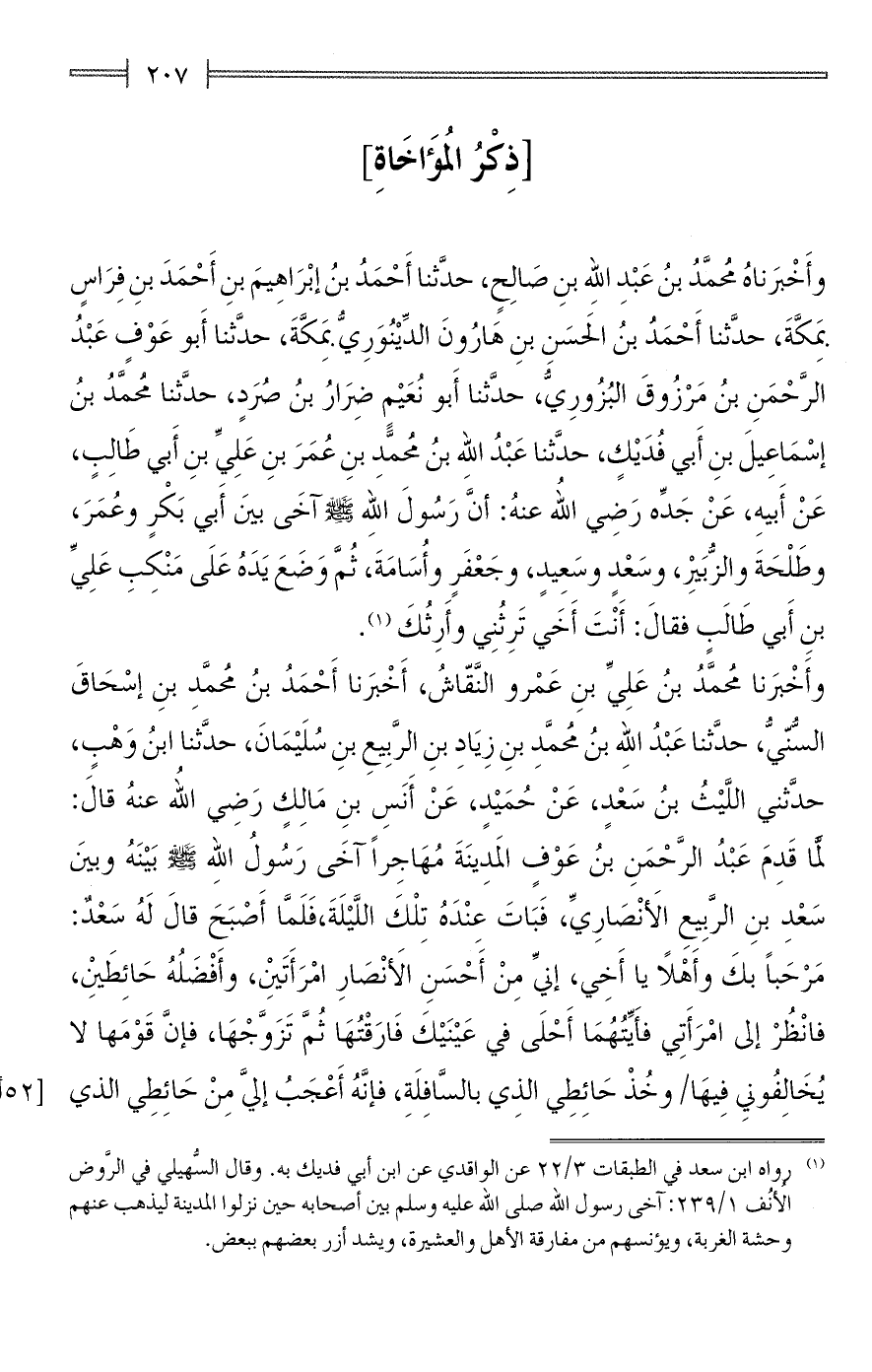 (¬1) رواه ابن سعد في الطبقات 3/ 22 عن الواقدي عن ابن أبي فديك به. وقال السُّهيلي في الرَّوض الأُنُف 1/ 239: آخى رسول الله صلى الله عليه وسلم بين أصحابه حين نزلوا المدينة ليذهب عنهم وحشة الغربة، ويؤنسهم من مفارقة الأهل والعشيرة، ويشد أزر بعضهم ببعض.