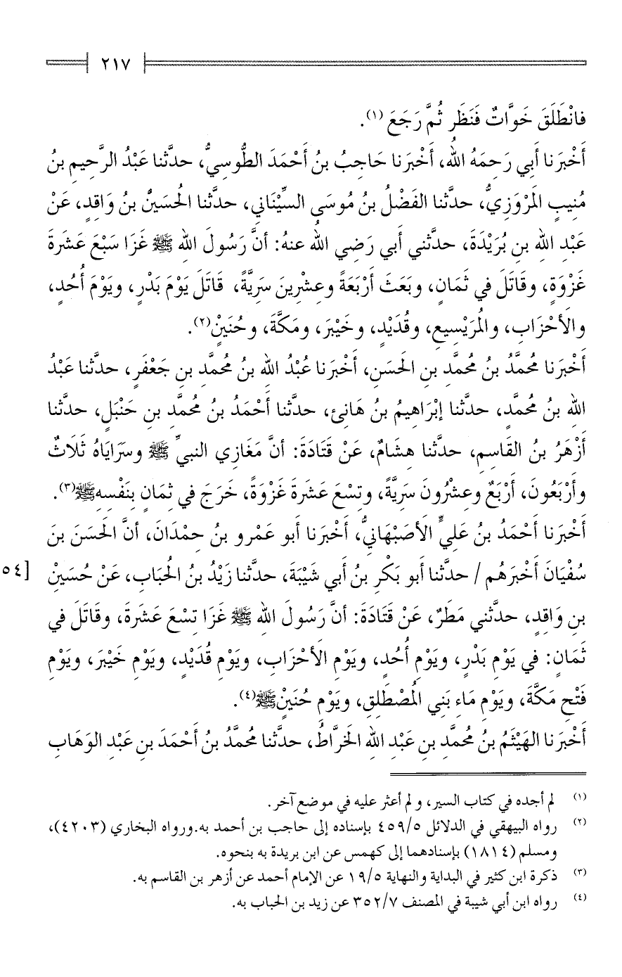 أَخْبَرنا أَبِي رَحِمَهُ اللهُ، أَخْبَرنا حَاجِبُ بنُ أَحْمَدَ الطُّوسِيُّ، حدَّثنا عَبْدُ الرَّحِيمِ بنُ مُنِيبٍ المَرْوَزِيُّ، حدَّثنا الفَضْلُ بنُ مُوسَى السِّيْنَانِي، حدَّثنا الحُسَين بنُ وَاقِدٍ، عَنْ عَبْدِ الله بنِ بُرَيْدَةَ، حدَّثني أَبي رَضِي الله عنهُ: أنَّ رَسُولَ الله - صلى الله عليه وسلم - غَزَا سَبْعَ عَشَرةَ غَزْوَةٍ، وقَاتَلَ في ثَمَانٍ، وبَعَثَ أَرْبَعَةً وعِشرِينَ سَرِيَّةً، قَاتَلَ يَوْمَ بَدْرٍ، ويَوْمَ أُحُدٍ، والأَحْزَابِ، والمُرَيْسِيعِ، وقُدَيْدٍ، وخَيْبَر، ومَكَّةَ، وحُنَيْنٍ (¬2).