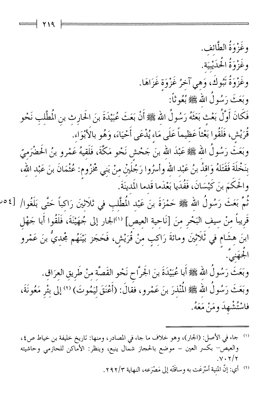ثُمَّ بَعَثَ رَسُولُ الله - صلى الله عليه وسلم - حَمْزَةَ بنَ عَبْدِ المُطَّلِبِ في ثلَاثِينَ رَاكِبًا حَتَّى بَلَغُوا قَرِيبًا مِنْ سِيفِ البَحْرِ مِنَ [نَاحِيةِ العِيصِ] (¬1) إلى جُهَيْنَةَ، فَلَقُوا أَبا جَهْلِ ابنَ هِشَامٍ في ثَلَاثِينَ ومائةَ رَاكِبٍ مِنْ قُرَيْشٍ، فَحَجَز بَيْنَهُم مجْدِيُّ بنَ عَمْرو الجُهَنِيَّ.