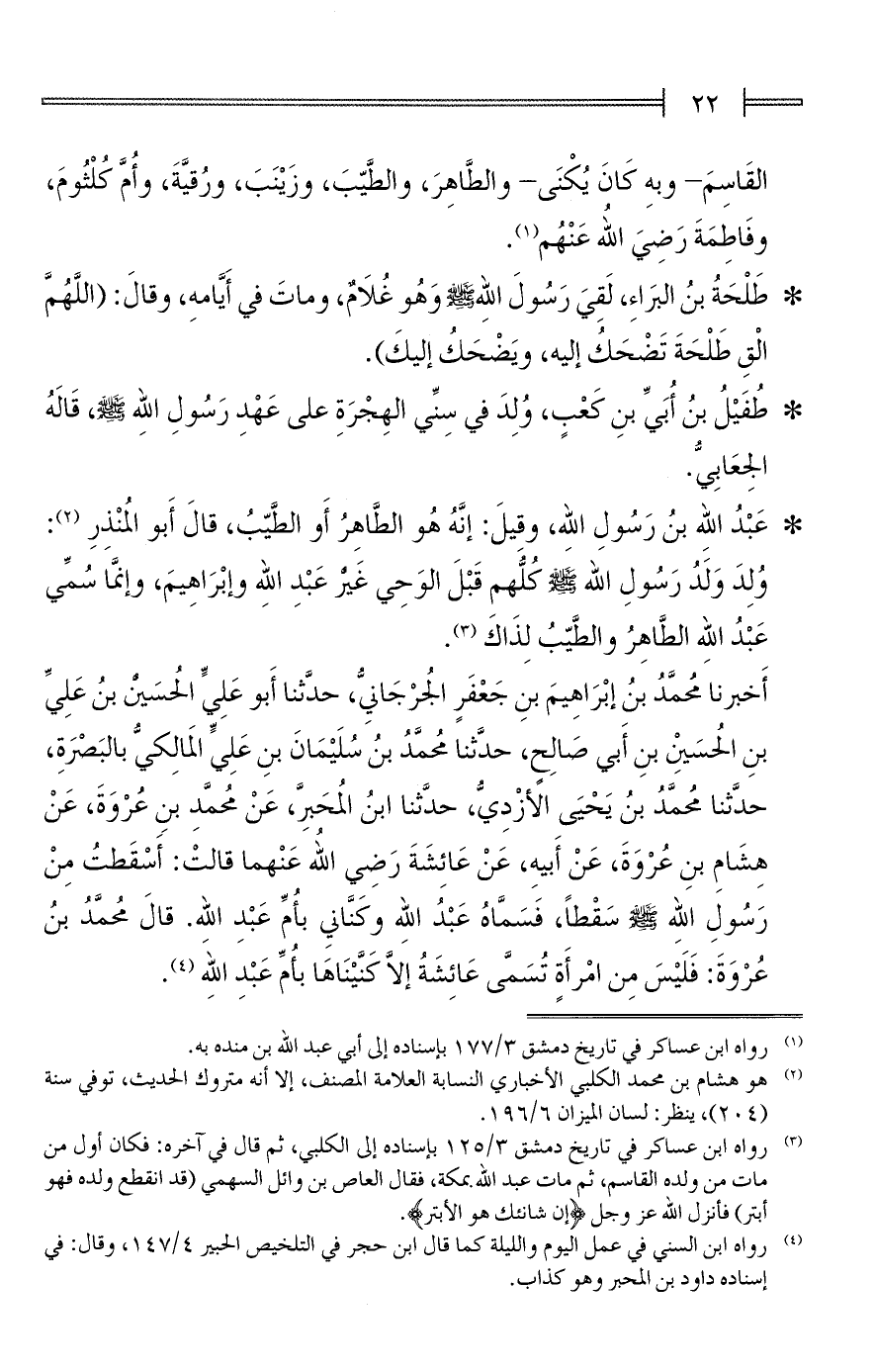 أَخبرنا مُحمَّدُ بنُ إبْرَاهِيمَ بنِ جَعْفَرٍ الجُرْجَانِيُّ، حدَّثنا أَبو عَلِىٍّ الحُسَينُ بنُ عَلِيِّ بنِ الحُسَينِ بنِ أَبي صالِحٍ، حدَّثنا مُحمَّدُ بنُ سليمَانَ بنِ عَلِىٍّ المَالِكيُّ بالبَصْرَةِ، حدَّثنا مُحمَّدُ بنُ يَحْيَى الأزْدِيُّ، حدَّثنا ابنُ المُحَبَّرِ، عَنْ مُحمَّدِ بنِ عُرْوَةَ، عَنْ هِشَامِ بنِ عُرْوَةَ، عَنْ أَبيهِ، عَنْ عَائِشَةَ رَضِي الله عَنْهما قالتْ: أَسْقَطتُ مِنْ رَسُولِ الله - صلى الله عليه وسلم - سَقْطًا، فَسَمَّاهُ عَبْدُ الله وكَنَّانيِ بأُمِّ عَبْدِ الله. قالَ مُحمَّدُ بنُ عُرْوَةَ: فَلَيْسَ مِن امْرأَةٍ تُسَمَّى عَائِشَةُ إلَّا كَنَّيْنَاهَا بأُمِّ عَبْدِ الله (¬4).
