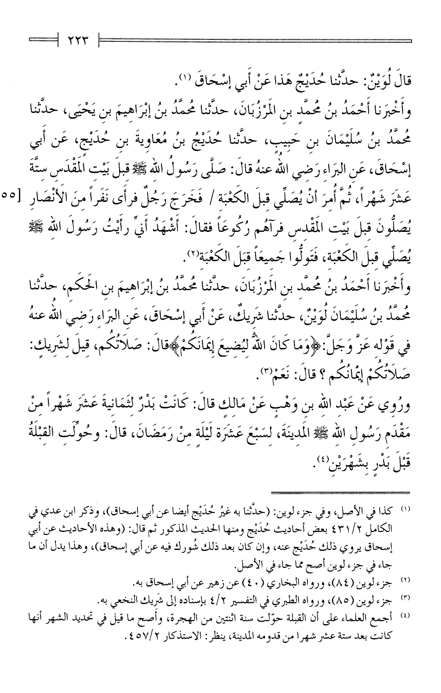 وأَخْبَرنا أَحْمَدُ بنُ مُحمَّدٍ بنِ المَرْزُبَانَ، حدَّثنا مُحمَّدُ بنُ إبْرَاهِيمَ بنِ يَحْيَى، حدَّثنا مُحمَّدُ بنُ سُلَيْمَانَ بنِ حَبِيبٍ، حدَّثنا حُدَيْجُ بنُ مُعَاوِيةَ بنِ حُدَيْجٍ، عَن أَبي إسْحَاقَ، عَنِ البَراءِ رَضي الله عنهُ قالَ: صَلَّى رَسُولُ الله - صلى الله عليه وسلم - قِبلَ بَيْتِ المَقْدَسِ سِتَّةَ عَشَرَ شَهْرًا، ثُمَّ أُمِرَ أنْ يُصَلِّي قِبلَ الكَعْبَةِ فَخَرَجَ رَجُلٌ فرأَى نَفَرًا مِنَ الأَنْصَارِ يُصَلُّونَ قِبلَ بَيْتِ المَقْدِسِ فرَآهُم رُكُوعًا فقالَ: أَشْهَدُ أَنِّي رأَيْتُ رَسُولَ اللهِ - صلى الله عليه وسلم - يُصَلِّي قِبلَ الكَعْبَةِ، فَتَولُّوا جَمِيعًا قِبَلَ الكَعْبَةِ (¬2).