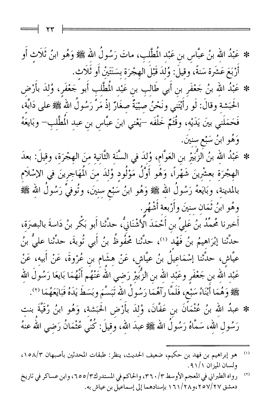 أَخبرنا مُحمَّدُ بنُ عَلِيِّ بنِ أَحْمَدَ الأُشْنَانِيُّ، حدَّثنا أَبو بَكْر بنُ دَاسةَ بالبصرَةِ، حدَّثنا إبْرَاهيمُ بنُ فَهْدٍ (¬1)، حدَّثنا محْفُوظُ بنُ أَبي تُوبةَ، حدَّثنا عليُّ بنُ عيَّاشٍ، حدَّثنا إسْمَاعِيلُ بنُ عيَّاشِ، عَنْ هِشامِ بنِ عُرْوةَ، عَنْ أَبيهِ، عَنْ عَبْدِ الله بنِ جَعْفَرٍ وعَبْد الله بنِ الزُّبَيرِ رَضِي الله عَنْهُم أَنَّهُمَا بَايعَا رَسُولَ اللهِ - صلى الله عليه وسلم - وَهُمَا أَبْنَاءُ سَبْعٍ، فَلَمَّا رآهُمَا رَسُولُ الله تَبَسَّمَ وبَسَطَ يَدَهُ فَبَايَعَهُمَا (¬2).