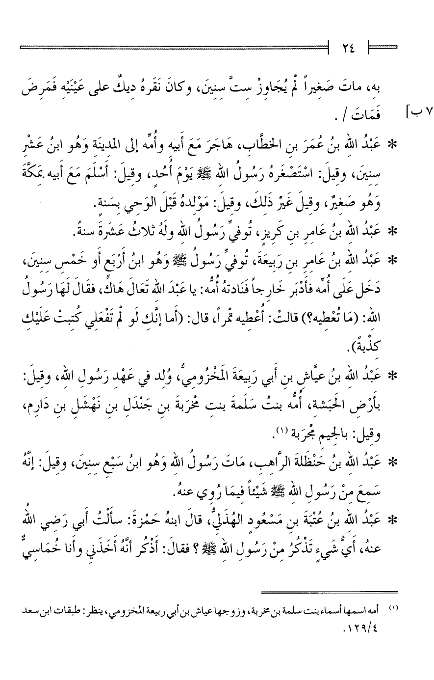 * عَبْدُ الله بنُ عُمَرَ بنِ الخطَّابِ، هَاجَرَ مَعَ أَبيهِ وأُمِّه إلى المدِينَةِ وَهُو ابنُ عَشْرِ سِنِينَ، وقِيلَ: اسْتَصْغَرهُ رَسُولُ اللهِ - صلى الله عليه وسلم - يَوْمَ أُحُدٍ، وقِيلَ: أَسْلَمَ مَعَ أَبيه بِمَكَّةَ وَهُو صغِيرٌ، وقِيلَ غَير ذَلِكَ، وقيلَ: مَوْلِدهُ قَبْلَ الوَحِي بِسَنةٍ.
