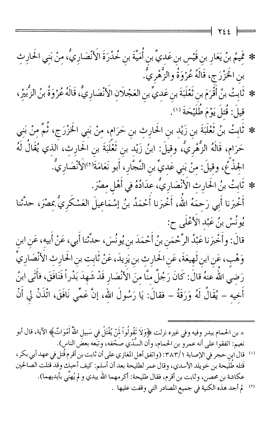 (¬1) قال ابن حجر في الإصابة 1/ 383: (واتفق أهل المغازي على أن ثابت بن أقرم قُتل في عهد أبي بكر، قَتله طُلَيحة بن خويلد الأسدي، وقال عمر لطليحة بعد أن أسلم: كيف أحبك وقد قتلت الصالحين عكاشة بن محصن، وثابت بن أقرم، فقال طليحة: أكرمهما الله بيدي ولم يُهنِّي بأيديهما).
