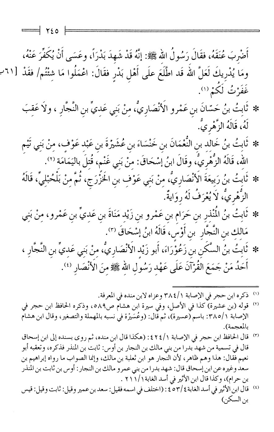 (¬3) قال الحافظ ابن حجر في الإصابة 1/ 424: (هكذا قال ابن منده، ثم روى بسنده إلى ابن إسحاق قال في تسمية من شهد بدرا من بني مالك بن النجار بن أوس: ثابت بن المنذر فذكره، وتعقبه أبو نعيم فقال: هذا وهم ظاهر، لأن النجار هو ابن ثعلبة بن مالك، وإنما الصواب ما رواه إبراهيم بن سعد وغيره عن ابن إسحاق قال: شهد بدرا من بني عمرو مالك بن النجار: أوس بن ثابت بن المنذر بن حرام)، وكذا قال ابن الأثير في أسد الغابة 1/ 211.