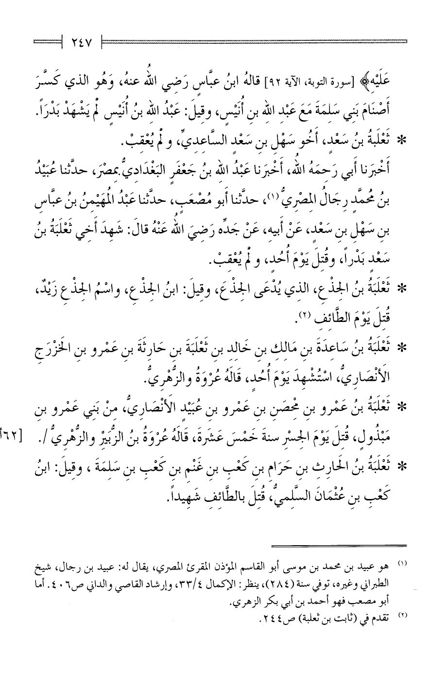 أَخْبَرنا أَبي رَحِمَهُ الله، أَخْبَرنا عَبْدُ الله بنُ جَعْفَرٍ البَغْدَادِيُّ بمِصْرَ، حدَّثنا عُبَيْدُ بنُ مُحمَّدٍ رِجَالُ المِصْرِيُّ (¬1)، حدَّثنا أَبو مُصْعَبٍ، حدَّثنا عَبْدُ المُهَيْمِنُ بنُ عبَّاسِ بنِ سَهْلِ بنِ سَعْدٍ، عَنْ أَبيهِ، عَنْ جَدِّه رَضِيَ الله عَنْهُ قالَ: شَهِدَ أَخِي ثَعْلَبَةُ بنُ سَعْدٍ بَدْرًا، وقُتِلَ يَوْمَ أُحُدٍ، ولمْ يُعْقِبْ.