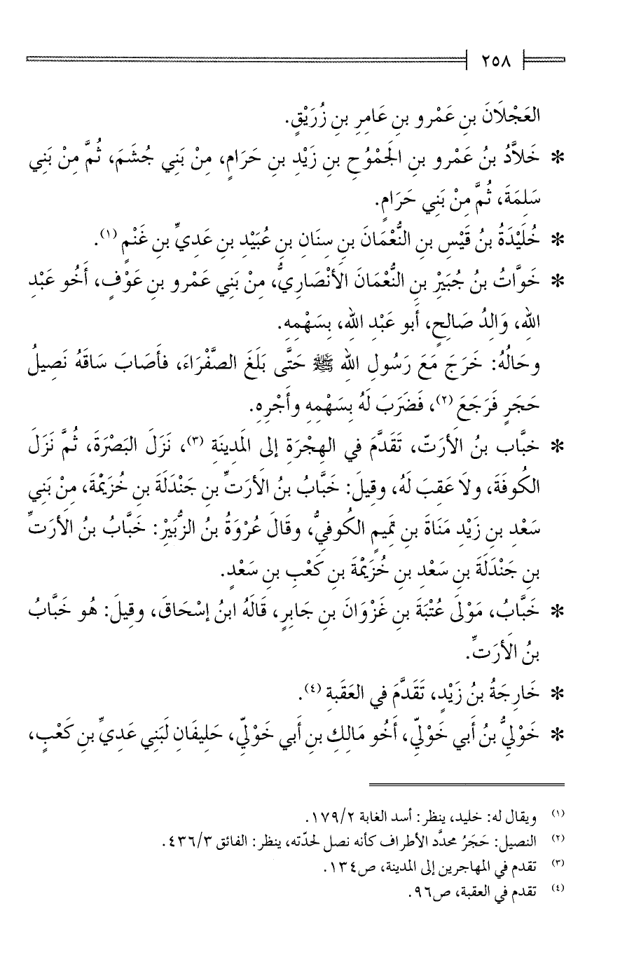 * خبَّاب بنُ الأَرَتّ، تَقَدَّمَ في الهِجْرَةِ إلى المَدِينَةِ (¬3)، نَزَلَ البَصْرَةَ، ثُمَّ نَزَلَ الكُوفَةَ، ولَا عَقِبَ لَهُ، وقِيلَ: خَبَّابُ بنُ الأَرَتِّ بنِ جَنْدَلَةَ بنِ خُزَيمةَ، مِنْ بَنِي سَعْدِ بنِ زَيْدِ مَنَاةَ بنِ تمِيمٍ الكُوفِيُّ، وقَالَ عُرْوَةُ بنُ الزُّبَيْرِ: خَبَّابُ بنُ الأَرَتِّ بنِ جَنْدَلَةَ بنِ سَعْدِ بنِ خُزَيمةَ بنِ كَعْبِ بنِ سَعْدٍ.