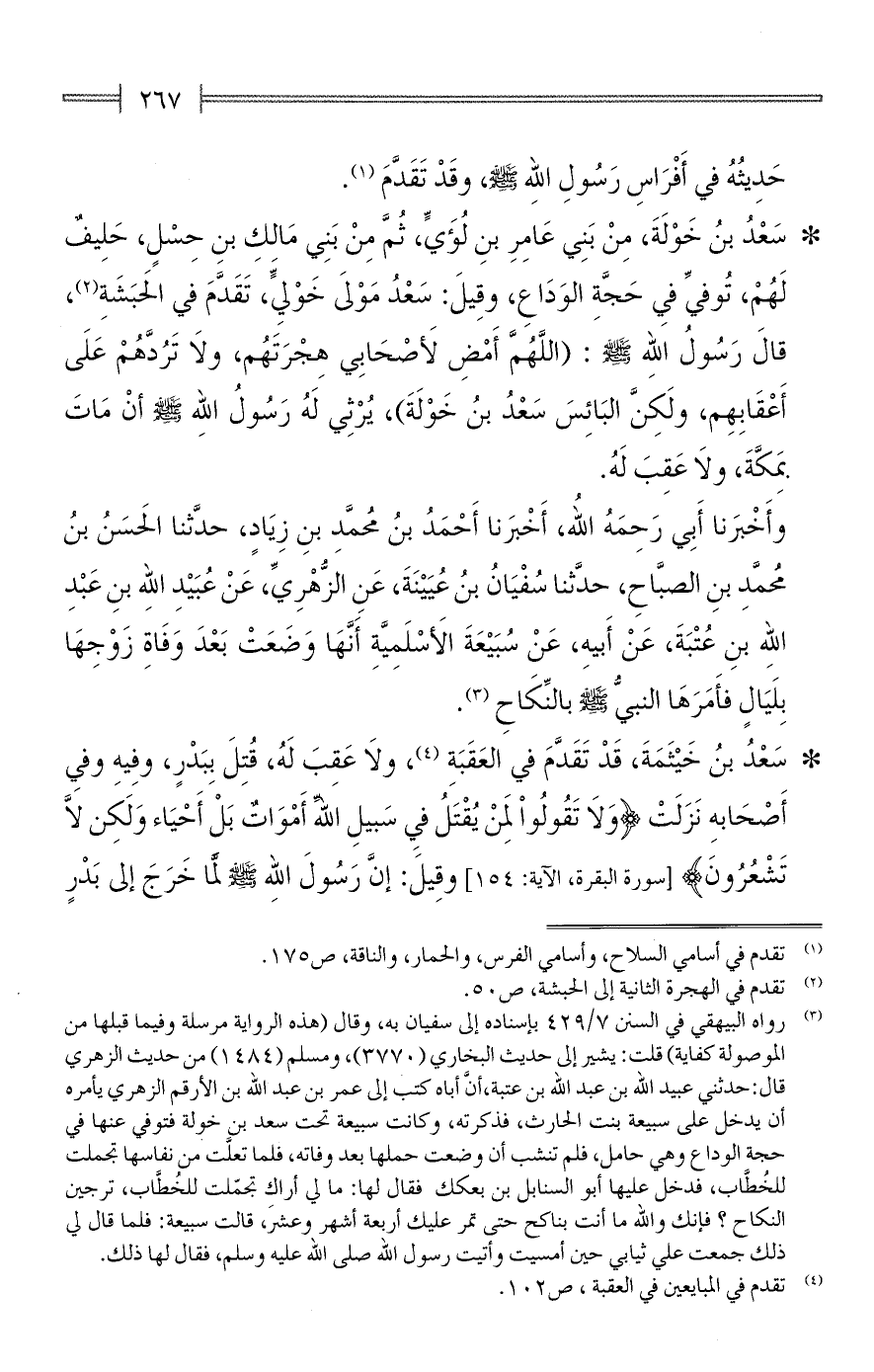 وأَخْبَرنا أَبِى رَحِمَهُ الله، أَخْبَرنا أَحْمَدُ بنُ مُحمَّدِ بنِ زِيَادٍ، حدَّثنا الحَسَنُ بنُ مُحمَّدِ بنِ الصبَّاحِ، حدَّثنا سُفْيَانُ بنُ عُيَيْنَةَ، عَنِ الزُّهْرِيِّ، عَنْ عُبَيْدِ الله بنِ عَبْدِ الله بنِ عُتْبَةَ، عَنْ أَبيهِ، عَنْ سُبَيْعَةَ الأَسْلَمِيَّةِ أَنَّهَا وَضَعَتْ بَعْدَ وَفَاةِ زَوْجِهَا بِلَيَالٍ فأَمَرَهَا النبيُّ - صلى الله عليه وسلم - بالنِّكَاحِ (¬3).