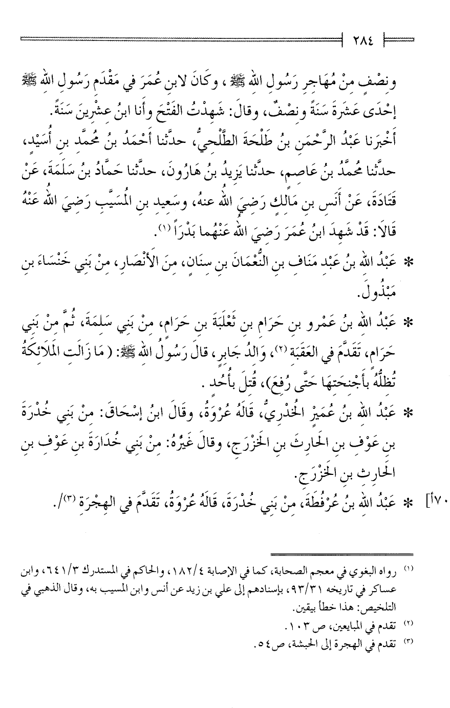 * عَبْدُ الله بنُ عَمْرو بنِ حَرَامِ بنِ ثَعْلَبَةَ بنِ حَرَامٍ، مِنْ بَنِي سَلِمَةَ، ثُمَّ مِنْ بَنِي حَرَامٍ، تَقَدَّمَ في العَقَبَةِ (¬2)، وَالِدُ جَابِرٍ، قالَ رَسُولُ الله - صلى الله عليه وسلم -: (مَا زَالَتِ المَلَائِكَةُ تُظِلُّهُ بأَجْنِحَتِهَا حَتَّى رُفِعَ)، قُتِلَ بأُحُدٍ.
