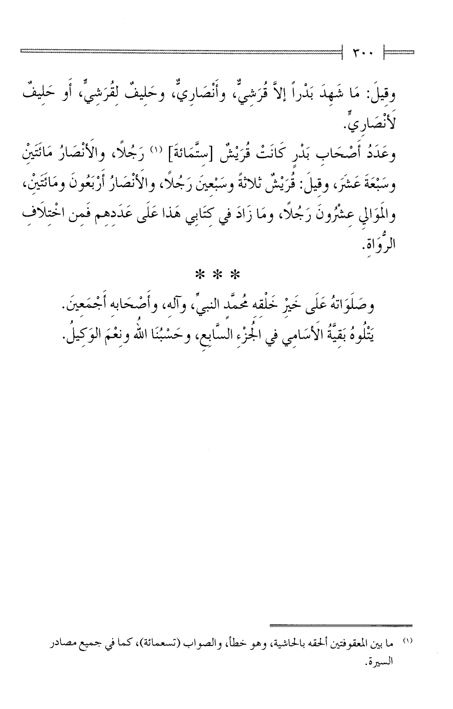 وعَدَدُ أَصحَابِ بَدْرٍ كَانَتْ قُرَيْشٌ [سِتَّمَائةَ] (¬1) رَجُلًا، والأَنْصَارُ مَائَتَينِ وسَبْعَةَ عَشَرَ، وقِيلَ: قُرَيْشٌ ثلاثةً وسَبْعِينَ رَجُلًا، والأَنْصَارُ أَرْبَعُونَ ومَائَتَينِ، والمَوَالي عِشْرُونَ رَجُلًا، ومَا زَادَ في كِتَابِي هَذا عَلَى عَدَدِهِم فَمِن اخْتِلَافِ الرُّوَاةِ.