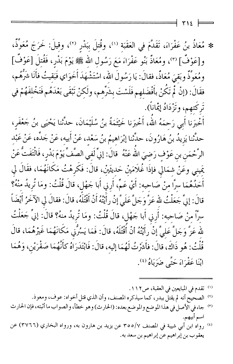 أَخْبَرنا أَبِي رَحِمَهُ الله، أَخْبَرنا خَيْثَمَةُ بنُ سلَيْمَانَ، حدَّثنا يَحْيَى بنُ جَعْفَرٍ، حدَّثنا يَزِيدُ بنُ هَارُونَ، حدَّثنا إبْرَاهِيمُ بنُ سَعْدٍ، عَنْ أَبيهِ، عَنْ جَدِّه، عَنْ عَبْدِ الرَّحْمَنِ بنِ عَوْفٍ رَضيَ الله عَنْهُ قالَ: إنِّي لَفِي الصَّفِّ يَوْمَ بَدْرٍ، فَالْتَفَتُّ عَنْ يَمِينِي وعَنْ شِمَاليِ فإذَا غُلَامَين حَدِيثَينِ، قالَ: فَكَرِهْتُ مَكَانَهُمَا، فقَالَ لي أَحَدُهُمَا سِرَّا مِنْ صَاحِبهِ: أَيْ عَمِّ، أَرِني أَبا جَهْلٍ، قالَ قُلْتُ: ومَا تُرِيدُ مِنْهُ؟ قالَ: إنِّي جَعَلْتُ للهِ عَزَّ وَجَلَّ عَلَيَّ إنْ رأَيْتُهُ أَنْ أَقْتُلَهُ، قالَ: فقالَ لي الآخَرُ أَيْضًا سرًّا مِنْ صَاحِبهِ: أَرِني أَبا جَهْلٍ، قالَ قُلْتُ: ومَا تُرِيدُ منهُ؟ قالَ: إنِّي جَعَلْتُ للهِ عَزَّ وَجَلَّ عَلِيَّ إنْ رأَيْتُهُ أنْ أَقْتُلَهُ، قالَ: فَمَا يَسُرُّنيِ مَكَانَهُمَا غَيرهُمَا، قالَ قُلْتُ: هُو ذَاكَ، قالَ: فأَشَرْتُ لَهُمَا إليهِ، قالَ: فَابْتَدَرَاهُ كأَنَّهُمَا صَقْرَيْنِ، وَهُمَا ابْنَا عَفْرَاءَ حَتَّى ضَرَبَاهُ (¬4).