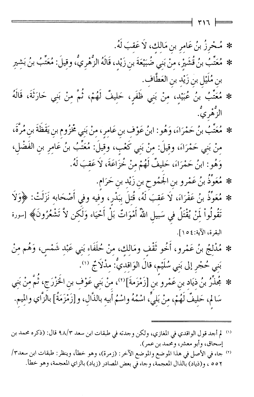 * مُعَوِّذُ بنُ عَفْرَاءَ، لَا عَقِبَ لَهُ، قُتِلَ بِبَدْرٍ، وفِيه وفي أَصْحَابهِ نَزَلَتْ: {وَلَا تَقُولُوا لِمَنْ يُقْتَلُ في سَبِيلِ اللهِ أَمْوَاتٌ بَلْ أَحْيَاءٌ وَلَكِنْ لَا تَشْعُرُونَ} [سورة البقرة، الآية: 154].