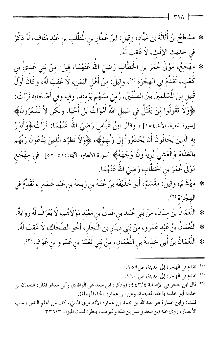 * مِهْجَعُ، مَوْلىَ عُمَرَ بنِ الخَطَّابِ رَضِيَ الله عَنْهُمَا، قِيلَ: مِنْ بَنِي عَدِيِّ بنِ كَعْبٍ، تَقَدَّمَ في الهِجْرَةِ (¬1)، وقِيلَ: مِنْ أَهْلِ اليَمَنِ، لَا عَقِبَ لَهُ، وكَانَ أَوَّلَ قَتيلٍ مِنَ المُسْلِمِينَ بينَ الصَّفّينِ، رُمِيَ بِسَهْمٍ يَوْمِئذٍ، وفِيه وفي أَصْحَابهِ نَزَلَتْ: {وَلَا تَقُولُوا لِمَنْ يُقْتَلُ في سَبِيلِ اللهِ أَمْوَاتٌ بَلْ أَحْيَاءٌ وَلَكِنْ لَا تَشْعُرُونَ} [سورة البقرة، الآية: 154] , وقالَ ابنُ عَبَّاسٍ رَضِيَ الله عَنْهُمَا: نَزَلَتْ {وَأَنْذِرْ بِهِ الَّذِينَ يَخَافُونَ أَنْ يُحْشَرُوا إِلَى رَبِّهِمْ} , {وَلَا تَطْرُدِ الَّذِينَ يَدْعُونَ رَبَّهُمْ بِالْغَدَاةِ وَالْعَشِيِّ يُرِيدُونَ وَجْهَهُ} [سورة الأنعام، الآيتان: 51 - 52] في مِهْجَعٍ مَوْلىَ عُمَرَ بنِ الخَطَّابِ رَضِيَ الله عَنْهُمَا.