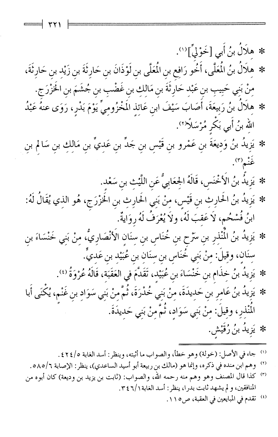 (¬3) كذا قال المصنف وهو وهم منه رحمه الله، والصواب: (ثابت بن يزيد بن وديعة) كان أبوه من المنافقين، ولم يشهد ثابت بدرا، ينظر: أسد الغابة 1/ 346.