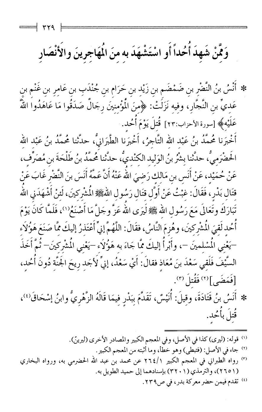 أَخْبَرنا مُحمَّدُ بنُ عَبْدِ الله التَّاجِرُ، أَخْبَرنا الطَّبَرانِيُّ، حدَّثنا مُحمَّدُ بنُ عَبْدِ اللهِ الحَضْرَمِيُّ، حدَّثنا بِشْرُ بنُ الوَلِيدِ الكِنْدِيُّ، حدَّثنا مُحمَّدُ بنُ طَلْحَةَ بنِ مُصَرِّفٍ، عَنْ حُمَيْدٍ، عَنْ أَنَسِ بنِ مَالِكِ رَضِيَ الله عَنْهُ أَنَّ عَمَّهُ أَنَسَ بنَ النَّضْرِ غَابَ عَنْ قِتَالِ بَدْرٍ، فَقَالَ: غِبْتُ عَنْ أَوّلِ قِتَالِ رَسُولِ الله - صلى الله عليه وسلم - والمُشْرِكِينَ، لَئِنْ أَشْهَدَنيِ الله تَبَارَكَ وتَعَالىَ مَعَ رَسُولِ اللهِ - صلى الله عليه وسلم - لَيَرى الله عَزَّ وجَلَّ مَا أَصْنَعُ (¬1)، فَلَمَّا كَانَ يَوْمَ أُحُدٍ لَقِيَ المُشْرِكِينَ، وهُزِمَ النَّاسُ، فقَالَ: اللَّهُمَّ إنِّي أَعْتَذِرُ إليكَ مِمَّا صَنَعَ هَؤُلَاءِ -يَعْنِي المُسْلِمينَ-، وأَبْرأُ إليكَ مِمَّا جَاءَ به هَؤُلَاءِ -يَعْنِي المُشْرِكِينَ- ثُمَّ أَخَذَ السَّيْفَ فَلَقِي سَعْدَ بنَ مُعَاذٍ فقالَ: أَيْ سَعْدُ، إنِّي لأَجَدِ رِيحَ الجَنَّةِ دُونَ أُحُدٍ، [فَمَضى] (¬2) فَقُتِلَ (¬3).